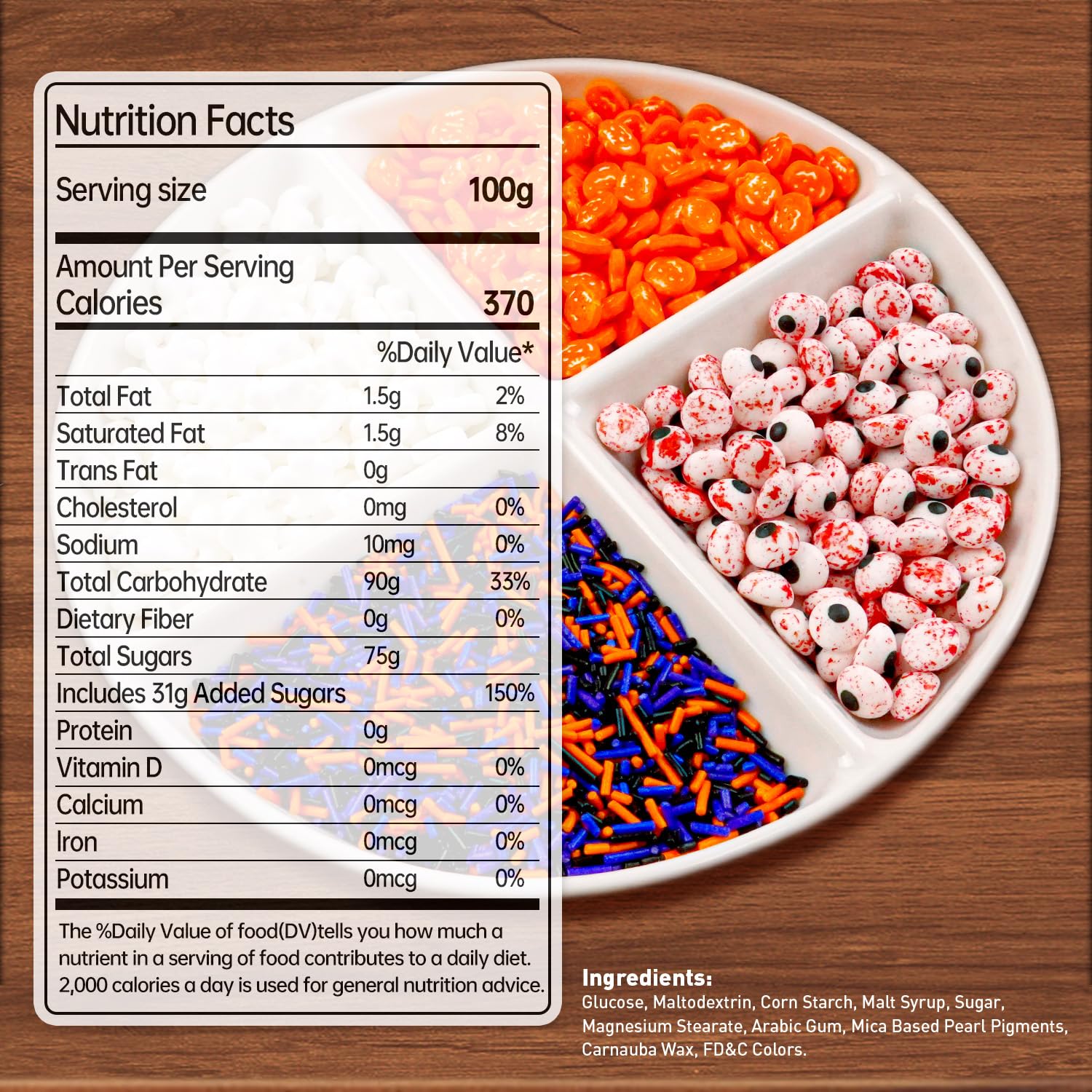 • [Food grade Halloween Sprinkles] This edible Halloween sprinkle are no gluten, no nut, no preservative, no dairy, no chemical, no GMO, low calorie, safe and healthy, suitable for different age costomers including little kids and even elderly people.