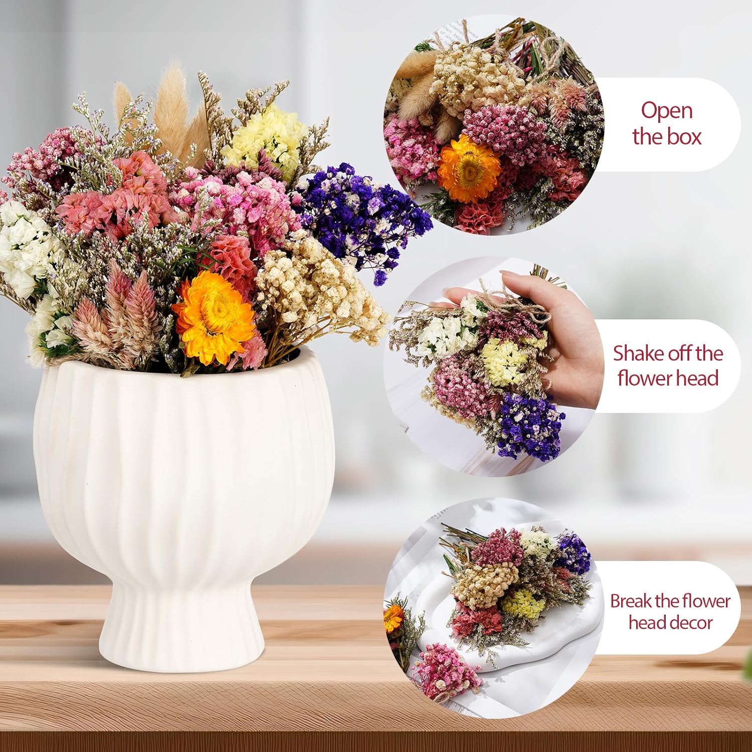 • Tips: In order to maintain the best condition of dried flowers, please keep them in a ventilated and dry place, avoid exposure to the sun. Since dried flowers are made of real flowers, 5% loss may occur during transportation, which is a normal phenomenon. If you have no objection to this, you are welcome to place an order and start the natural aesthetics tour. In order to avoid losses, our products are packaged in cardboard boxes, and we do our best to give you a good experience