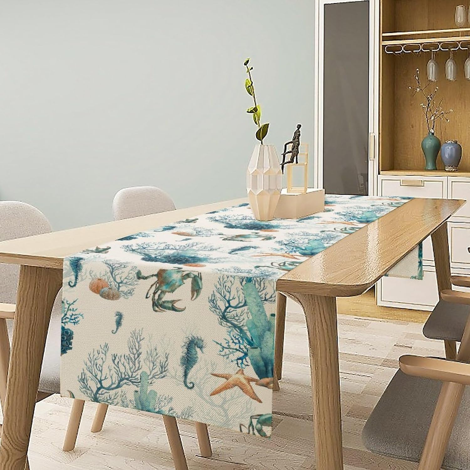 Nautical Coast Table Flag, Ocean Beach Seahorse Shell, Vintage Sailboat Lighthouse Anchor Table Decoration for Indoor and Outdoor Home Party Decor 13x120 Inch
