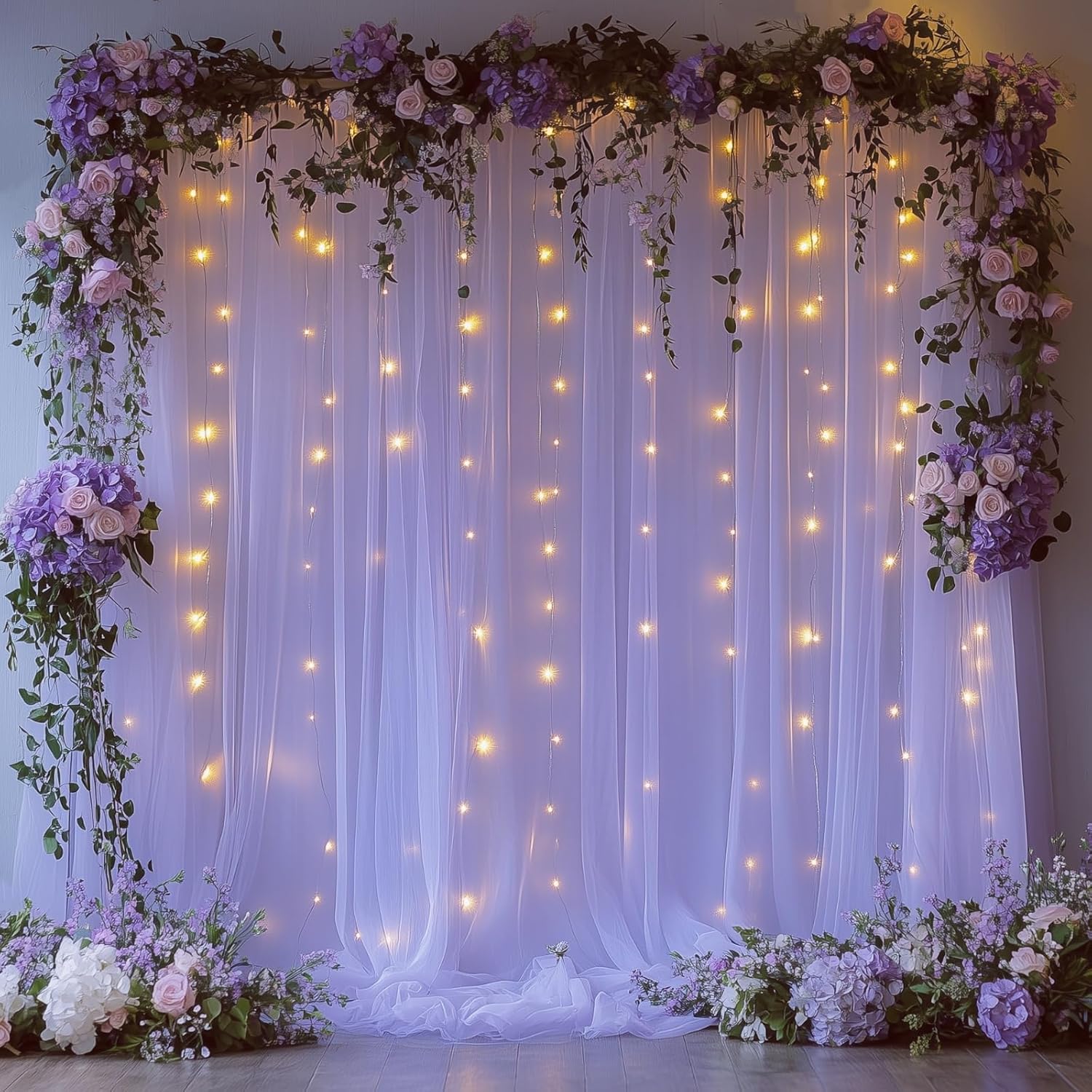 • Elegant Combination of Tulle Backdrop Curtains and Lights - Package Includes: 2 panels lavender sheer tulle backdrop curtains (5ft x8ft each, total 10x8ft).1 set of a 10x8.2ft warm white USB-powered tangle-free string lights (10 strands with 250 LEDs). 12 Transparent clips for hassle-free Installation. (Pro Tip: Buy multiple sets for fuller coverage and reduced sheerness!)
