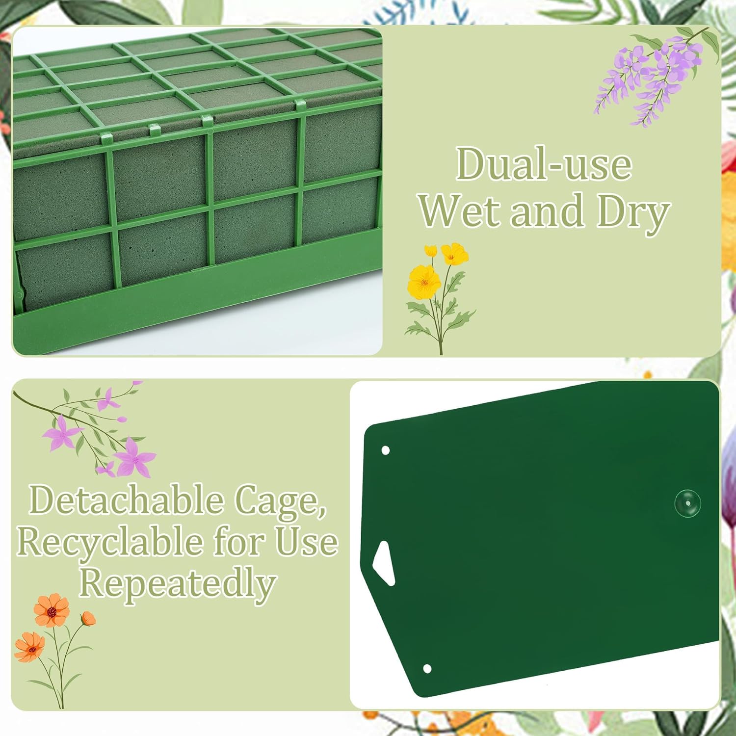 • Practical Design: this floral foam product features a lightweight green cage that offers excellent support to help secure your flower arrangements more effectively; the uniquely designed rectangular wet floral foam absorbs water quickly and has low drainage, enabling it to firmly hold stems in place while keeping your flowers and plants fresh for longer