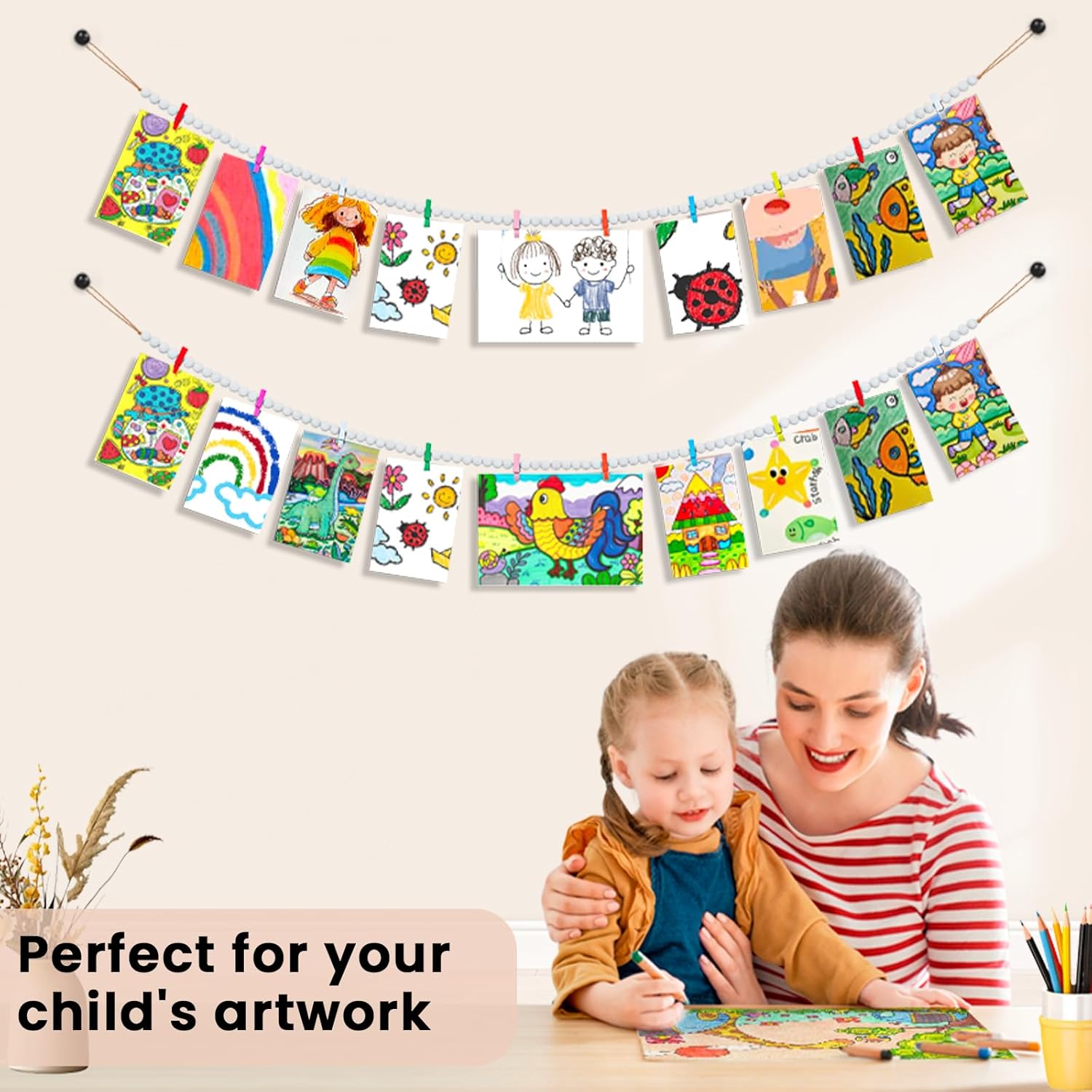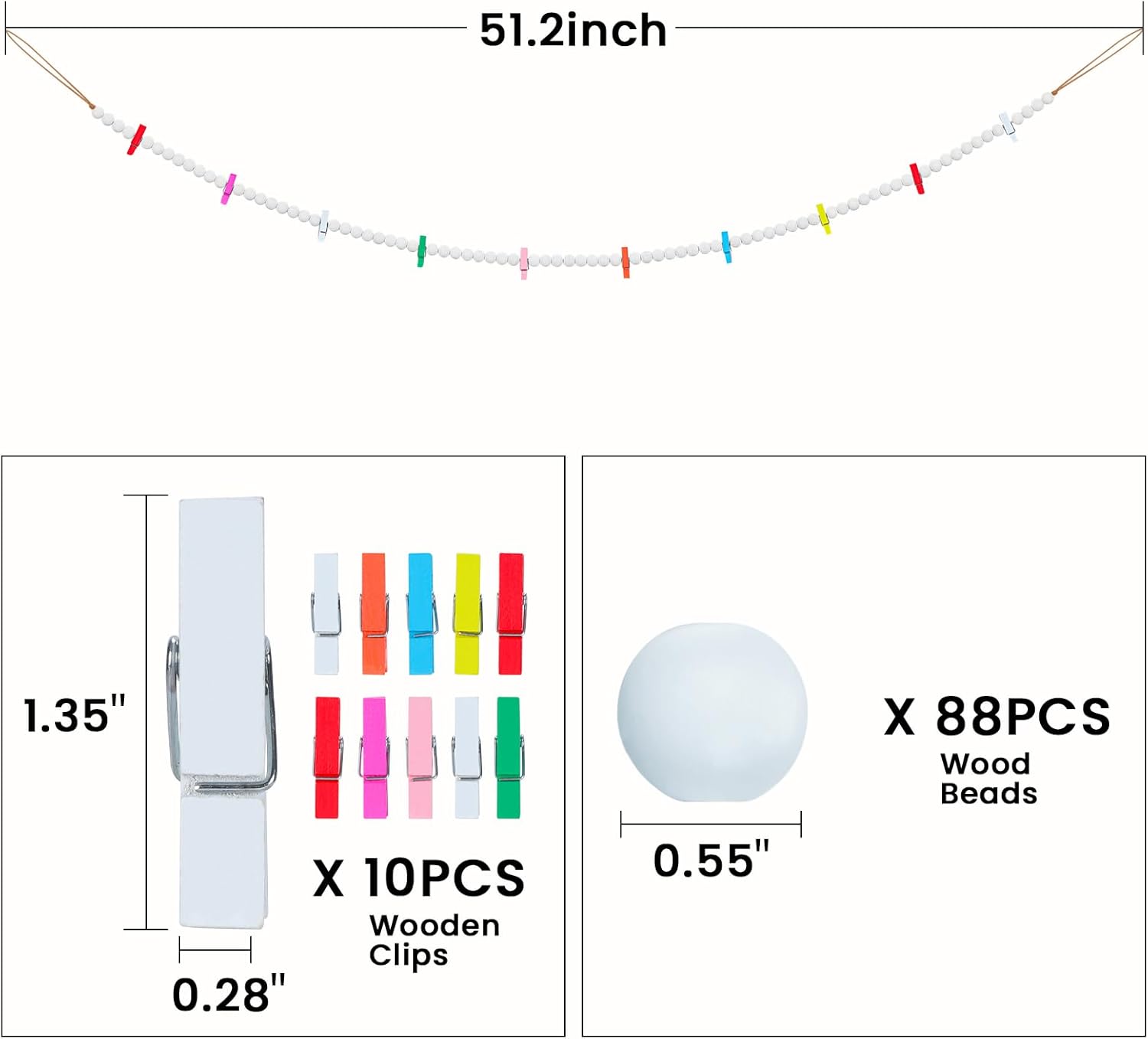 • This hanging photo display is hand-made with white wooden beads and cotton rope, durable, corrosion-resistant and non-toxic, not easy to break and fade. Note: The colours of the wooden clips are random