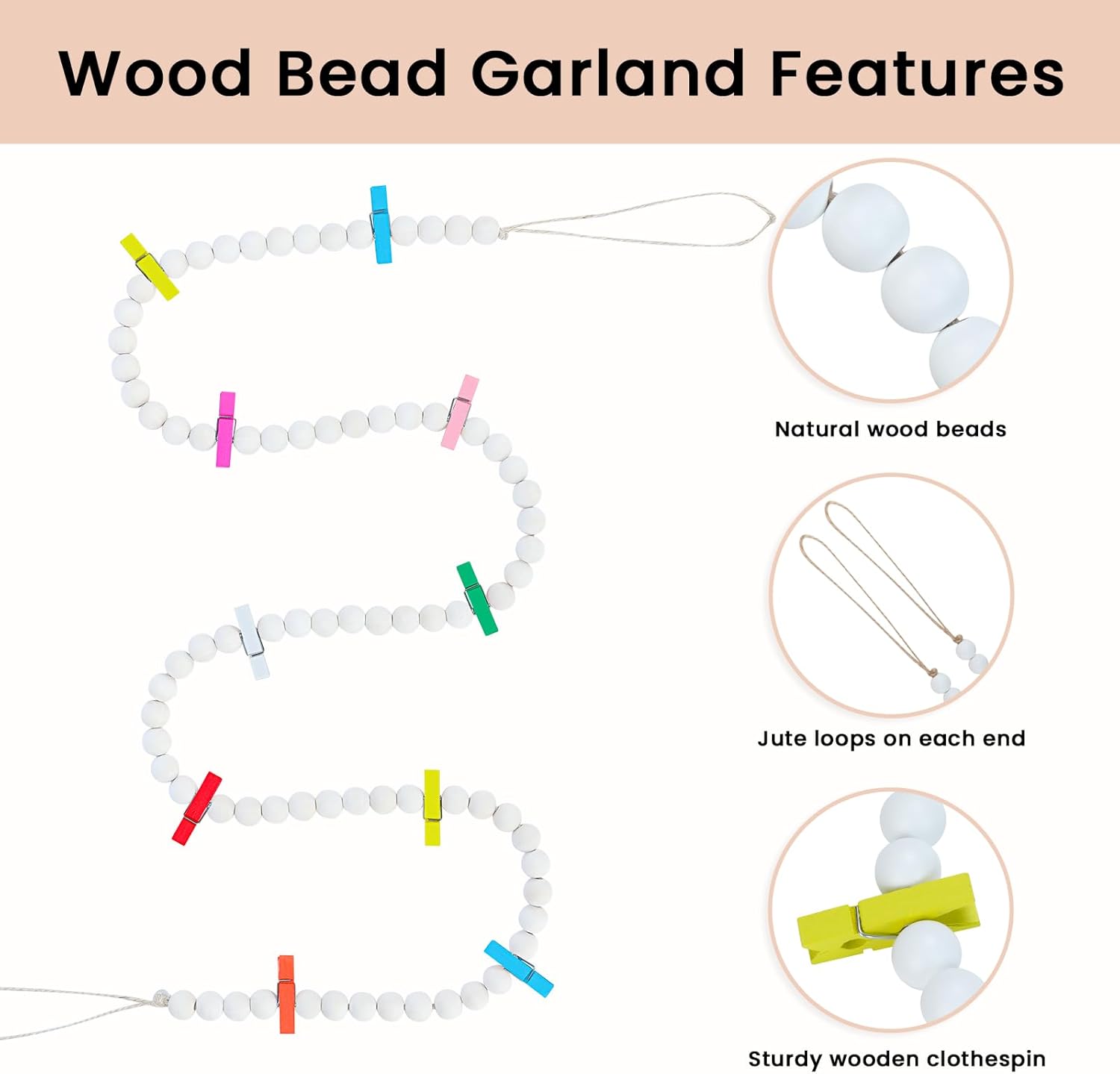 • The total length of wood bead garland is 54.8". Each garland includes 10 clips, you can give your custom wall art a makeover any time you want by simply removing or adding photos. Easily add some special to your beautiful bohemian home decor, sweet farmhouse decor, or modern minimalist style