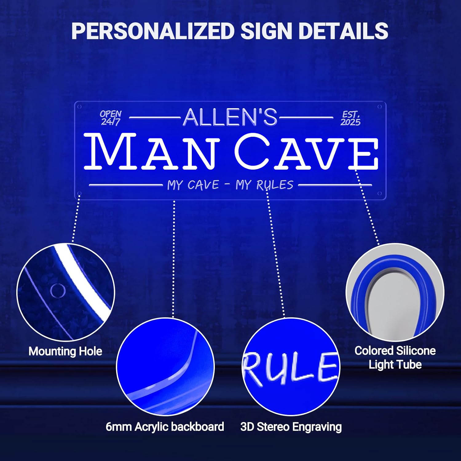 • 🌟【3D Engraving Process】Our customizable man cave neon signs feature a upgraded 3D engraving process, where custom text and graphics are etched onto a clear acrylic board. The stereo carvings are colorless and illuminated by vibrant colored LED neon strips that bring out the best 3D lighting, adding depth and brightness to turn any wall into a personalized artwork.