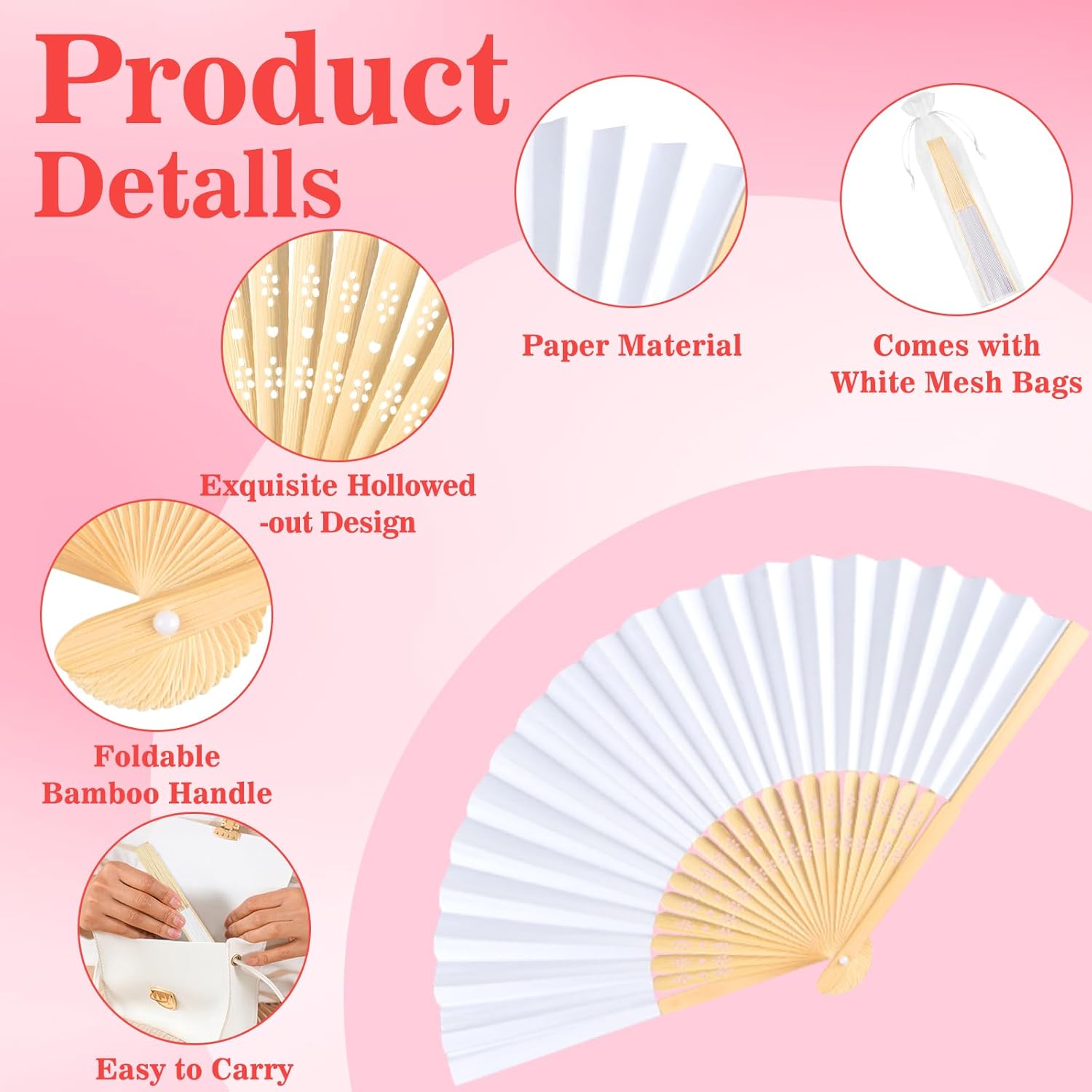 • Set Contents: You will get 24 white paper fans, each folding fan comes with a mesh bag, which are good looking and practical, can meet various occasions needs