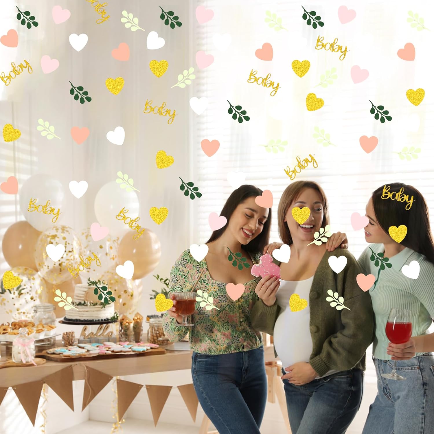 • 1.The baby girl baby shower decorations confetti package include:200pcs total,there are 3designs heart sage leaves and “baby” letters in 6 colors(shiny gold/light green/dark green/white/blush pink/peach pink),looks warm and full of vigor.