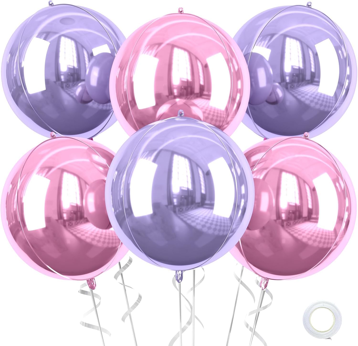 Pink Purple Giant 4D Foil Balloons, 6 Pcs Large Metallic Pink and Purple Round Balloons, 22 Inch Big Round Foil Balloon for Wedding Prom Birthday Party Baby Shower Decorations