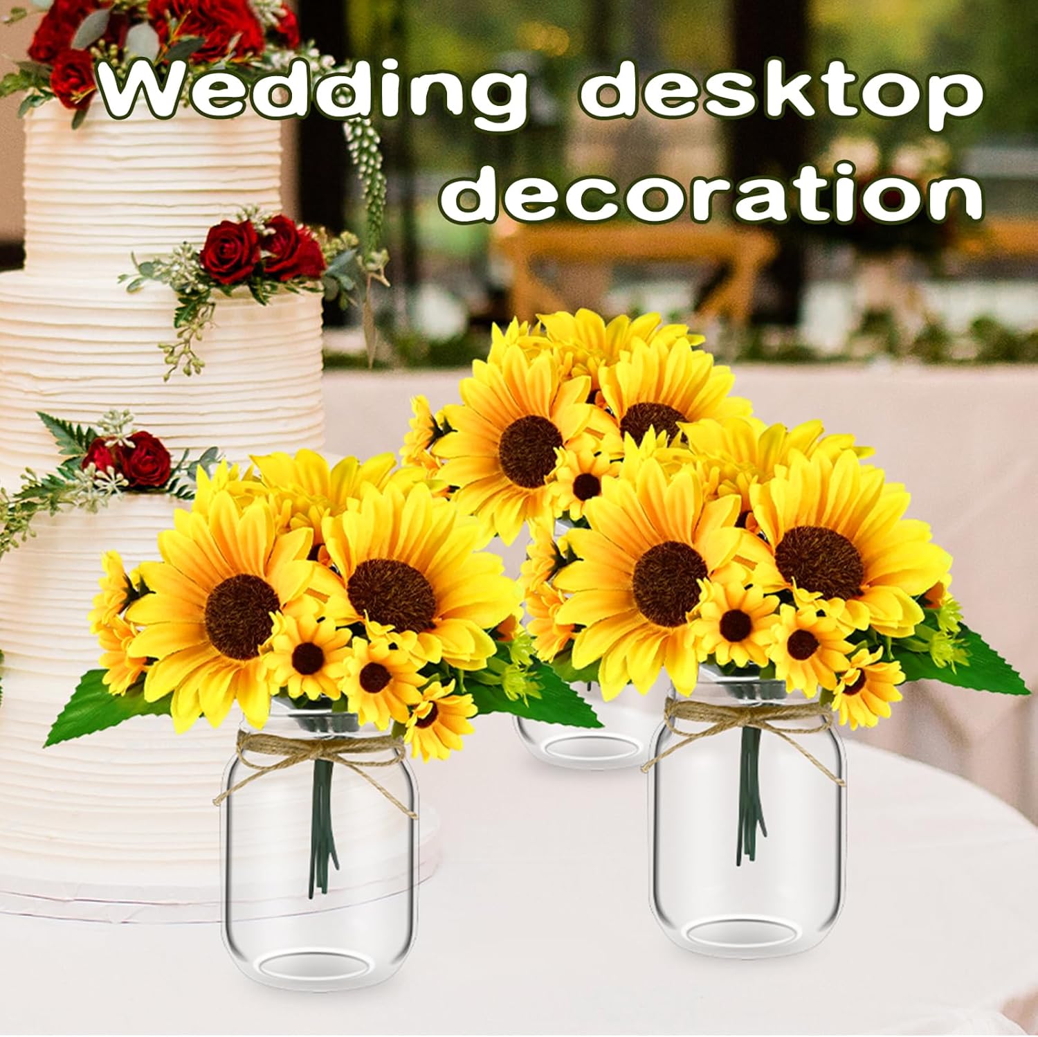 • 6 Set Mason Jar Table Centerpiece with Flower: Centerpiece table decorations includes 6 durable 17oz glass mason jars, 6 vibrant faux sunflower stems, 10 meters of jute rope. Perfect for creating stunning center pieces decoration for table, wedding centerpieces for tables, or table centerpieces for party event