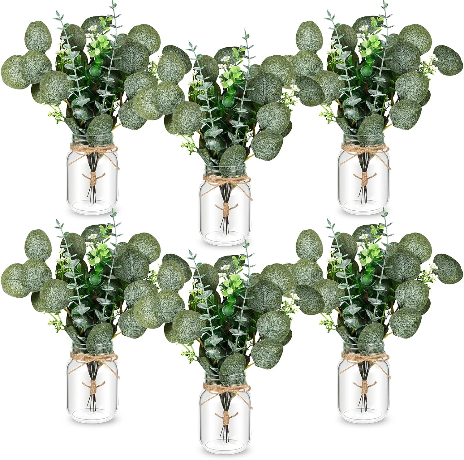 • 6 Set Mason Jar Table Centerpiece with Flower: Centerpiece table decorations includes 6 durable 17oz glass mason jars, 6 faux eucalyptus, 10 meters of jute rope. Perfect for creating stunning center pieces decoration for table, wedding centerpieces for tables, or table centerpieces for party event