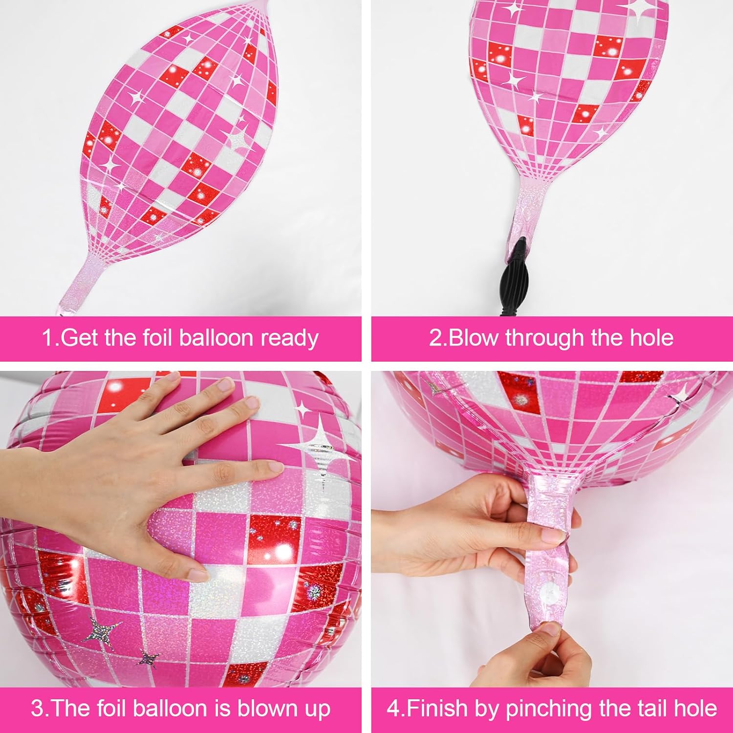 • EASY TO USE:These pink disco ball decorations balloons can be filled with air or helium.pinch the inflation port of the disco balloon to seal it.the set comes with a straw and ribbon,after the party is over,use the straw to deflate by inserting it into the inflation port,balloons can be reused
