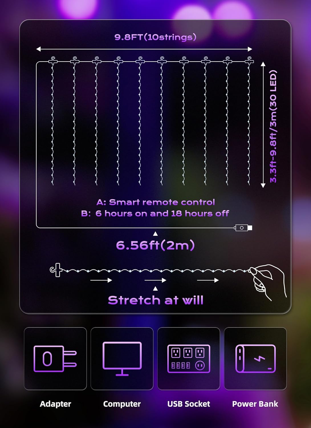 • [Safety & Decoration] Operated with 5V low voltage, our fairy curtain lights glow with low heating, and it is safe to touch; It can be safely hung on the curtains or on the wall. It is a wonderful decor for dorm, college, bedroom, party, birthday, wedding, Christmas, New Year, indoor, outdoor, classroom