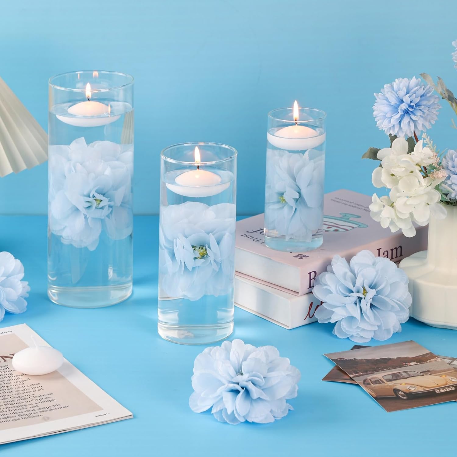 • FITS ALL VASE SIZES & SCENARIOS: Works perfectly with 3/4/5-inch diameter vases (narrow or wide). Bule flowers float steadily, candles burn evenly without tipping, suitable for wedding, dinners, bathrooms, party event, or daily table centerpieces decor