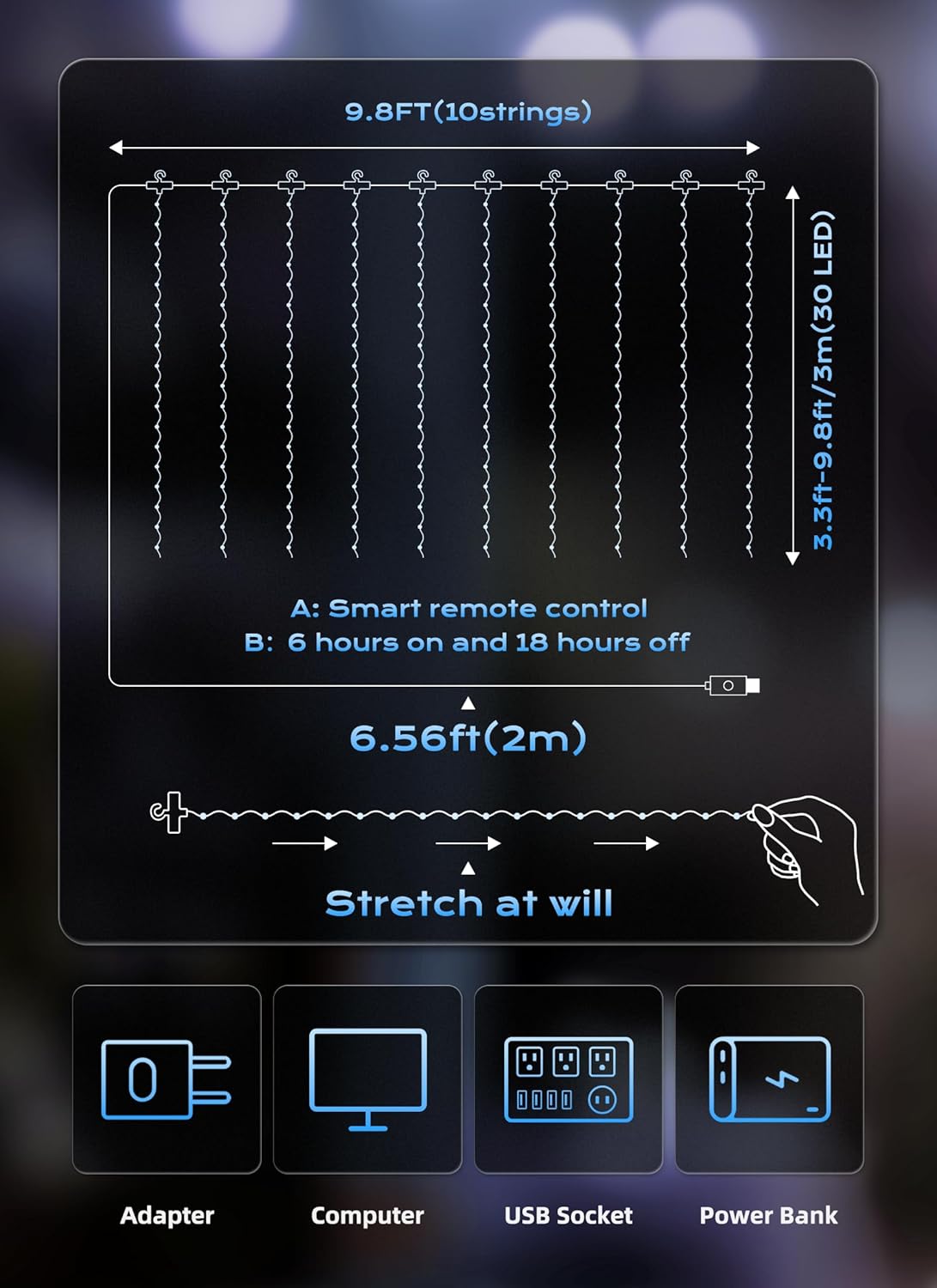 • [Safety & Decoration] Operated with 5V low voltage, our fairy curtain lights glow with low heating, and it is safe to touch; It can be safely hung on the curtains or on the wall. It is a wonderful decor for dorm, college, bedroom, party, birthday, wedding, Christmas, New Year, indoor, outdoor, classroom, Winter Wonderland Decorations