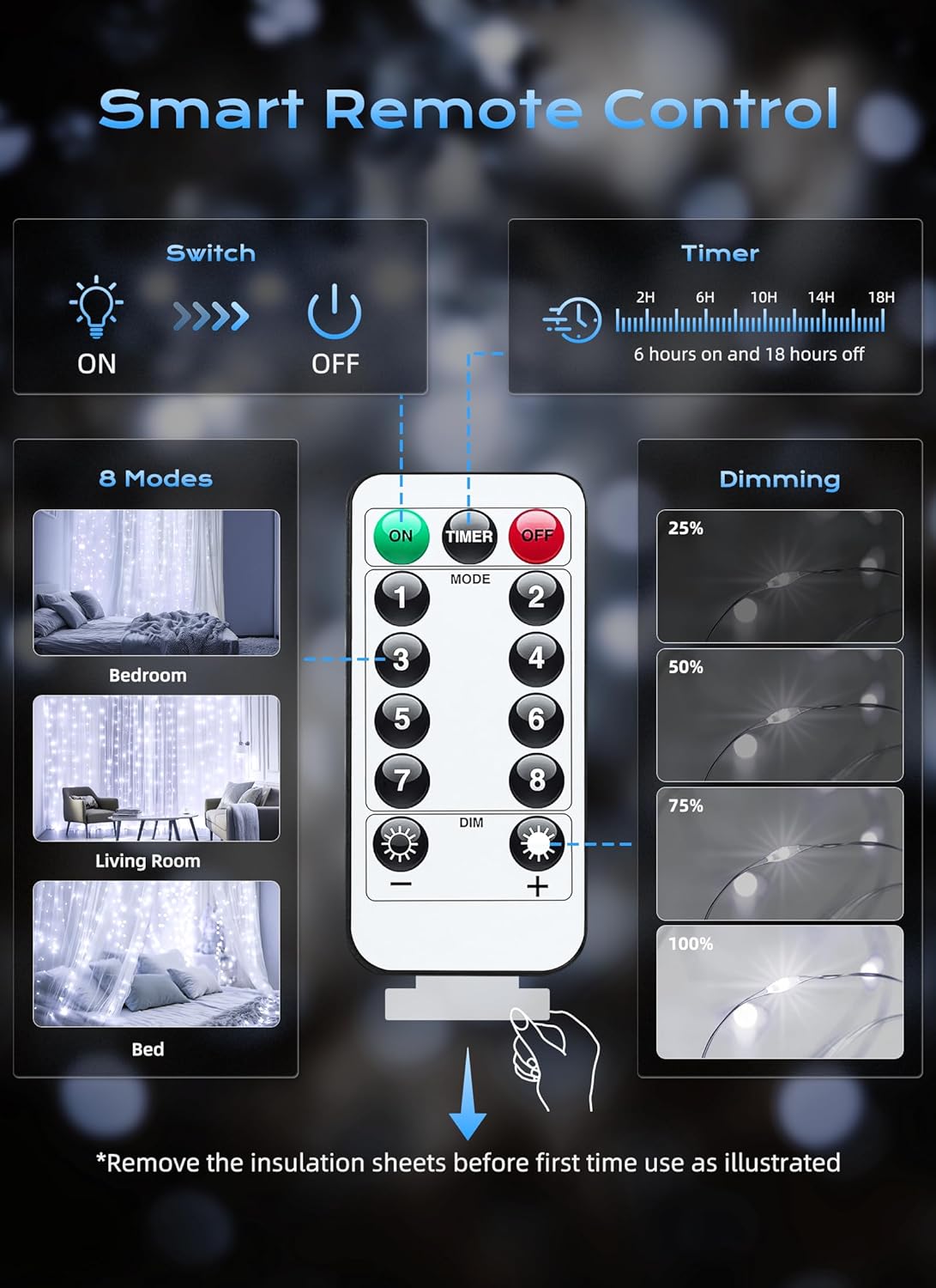 • [Timer & Remote] We can use the remote control to timing for 6 hours on and 18 hours off. What's more, the brightness of our curtain lights is adjustable of 20% 40% 60% 80% 100%