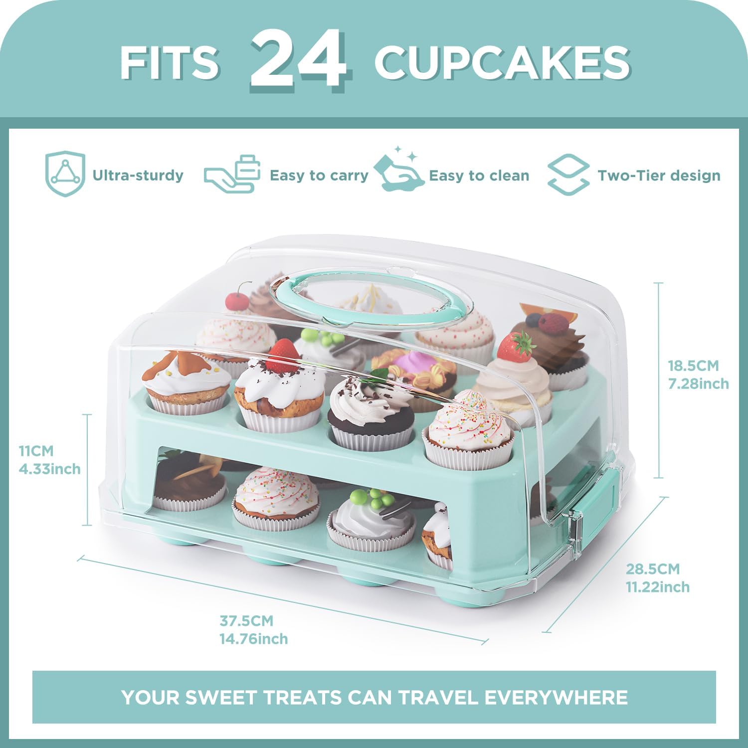 Cupcake Carrier 24 Count, Green Cupcake Holder, Cupcake Container with Lid and Handles, Muffin Traveler Two Tier Stand Reusable Cupcake Box