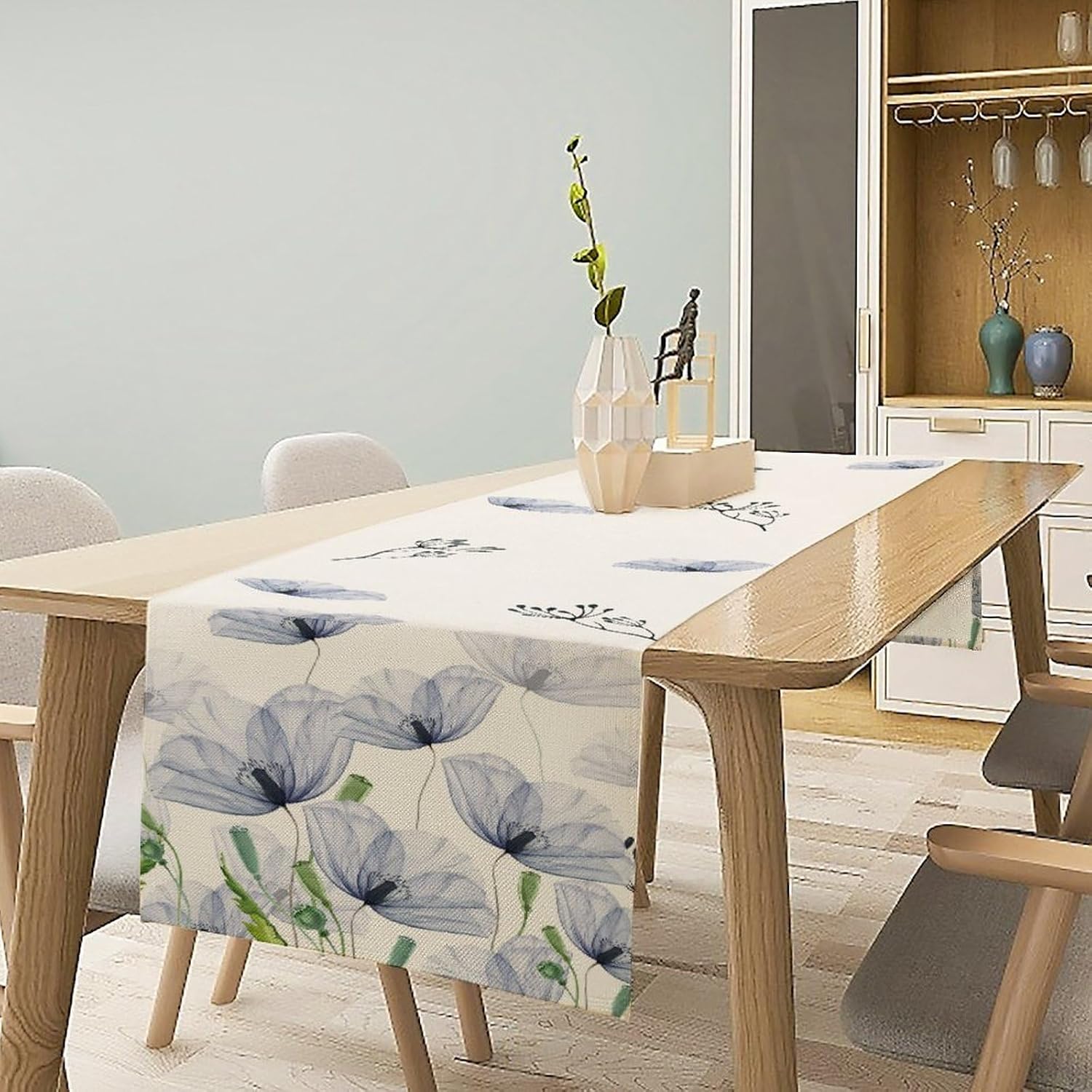 Watercolor Poppy Floral Table Runner, Abstract Seasonal Spring Summer Blue Purple Flower Kitchen Dinning Table Runner for Indoor Outdoor Home Wedding Party Holiday, 13x90 Inch