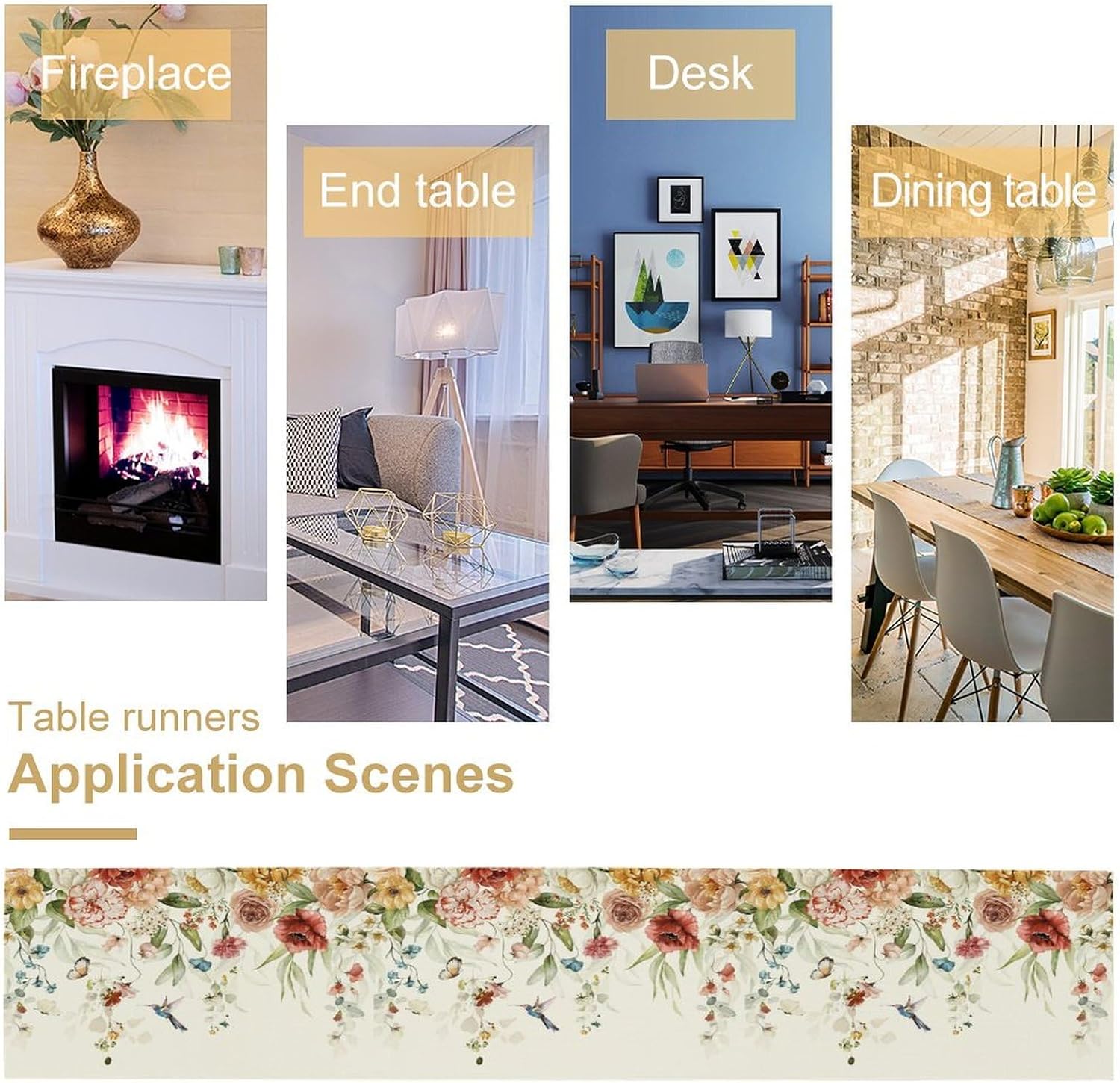 Rustic Floral Table Runner, Watercolor Flower Leaves Hummingbird Butterfly Farmhouse Kitchen Dinning Table Runner for Indoor Outdoor Home Wedding Party Holiday, 13x36 Inch