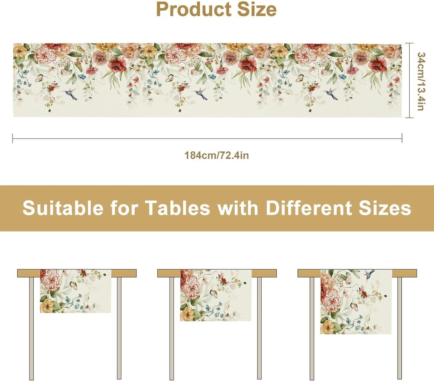 Rustic Floral Table Runner, Watercolor Flower Leaves Hummingbird Butterfly Farmhouse Kitchen Dinning Table Runner for Indoor Outdoor Home Wedding Party Holiday, 13x108 Inch