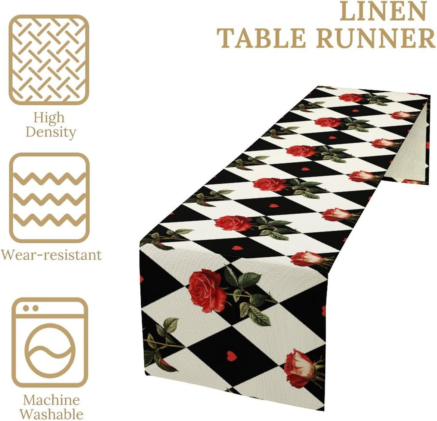Vintage Rose Table Runner, Red Rose Hearts Black White Checkered Background Table Runner for Kitchen Dinning Table Runner Decor Home Wedding Party Holiday, 13x90 Inch