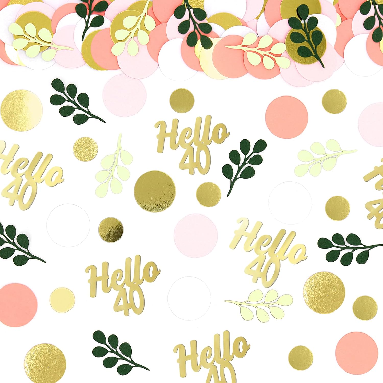 • 3.Charming Colors.The hello forty birthday table confetti combined 6 colors(shiny gold foil paper/blush pink/peach pink/white/light green/dark green) ,the vibrant colors make the birthday table decor warm and full of vigor.