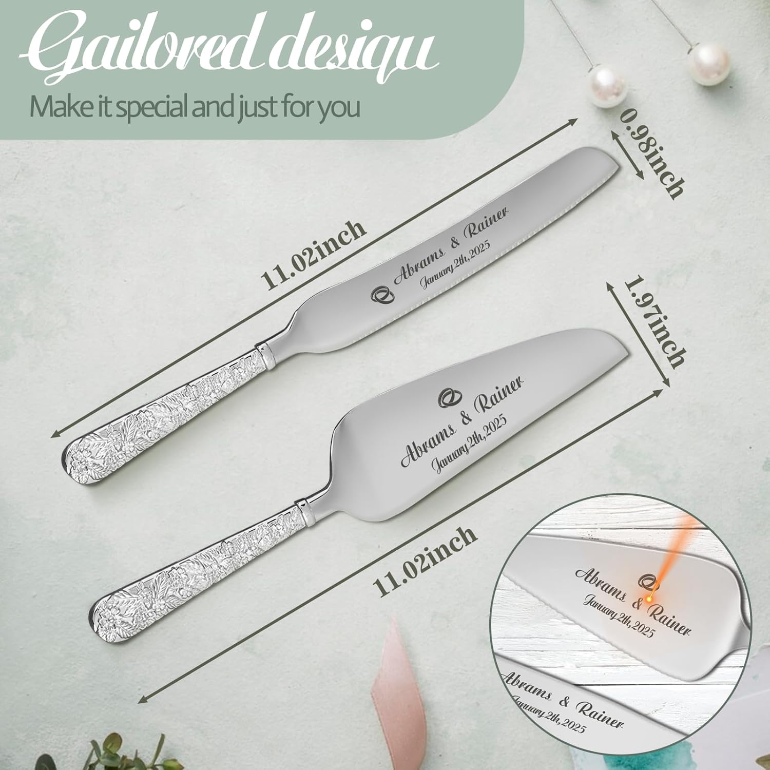 • Personalized Wedding Cake Cutting Set : Personalize the cake knife and server with names, dates,transforming them into a one-of-a-kind keepsake. The precision engraving turning your cake-cutting ceremony into a moment to cherish for a lifetime