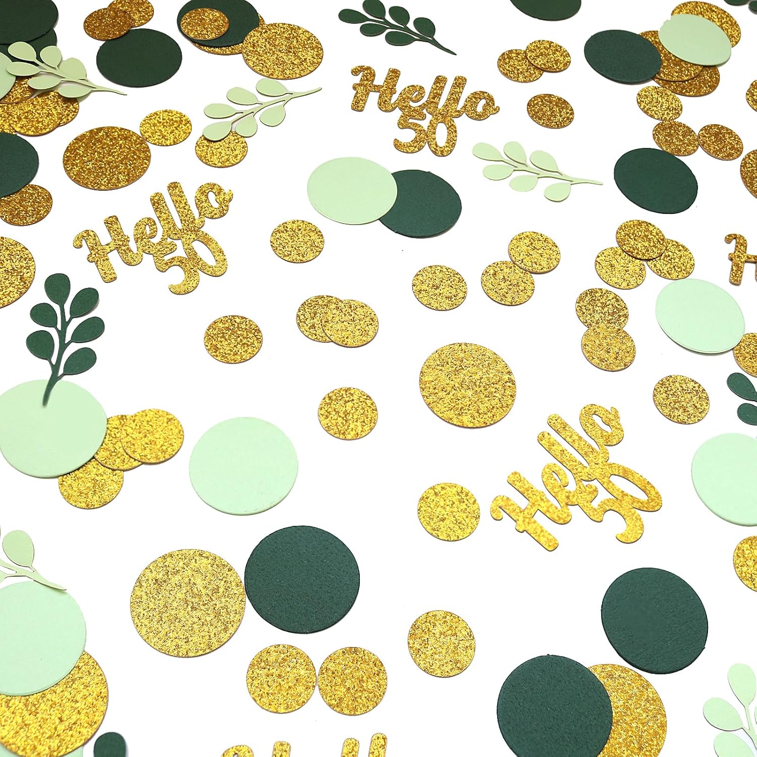 • 1.Great Addition to 50 Birthday Party.The green and gold circle dots with hello 50 confetti scatter are shiny and fresh,very sparkle,a perfect addition to 50th birthday theme,nice sage green 50th birthday decorations for women/men.