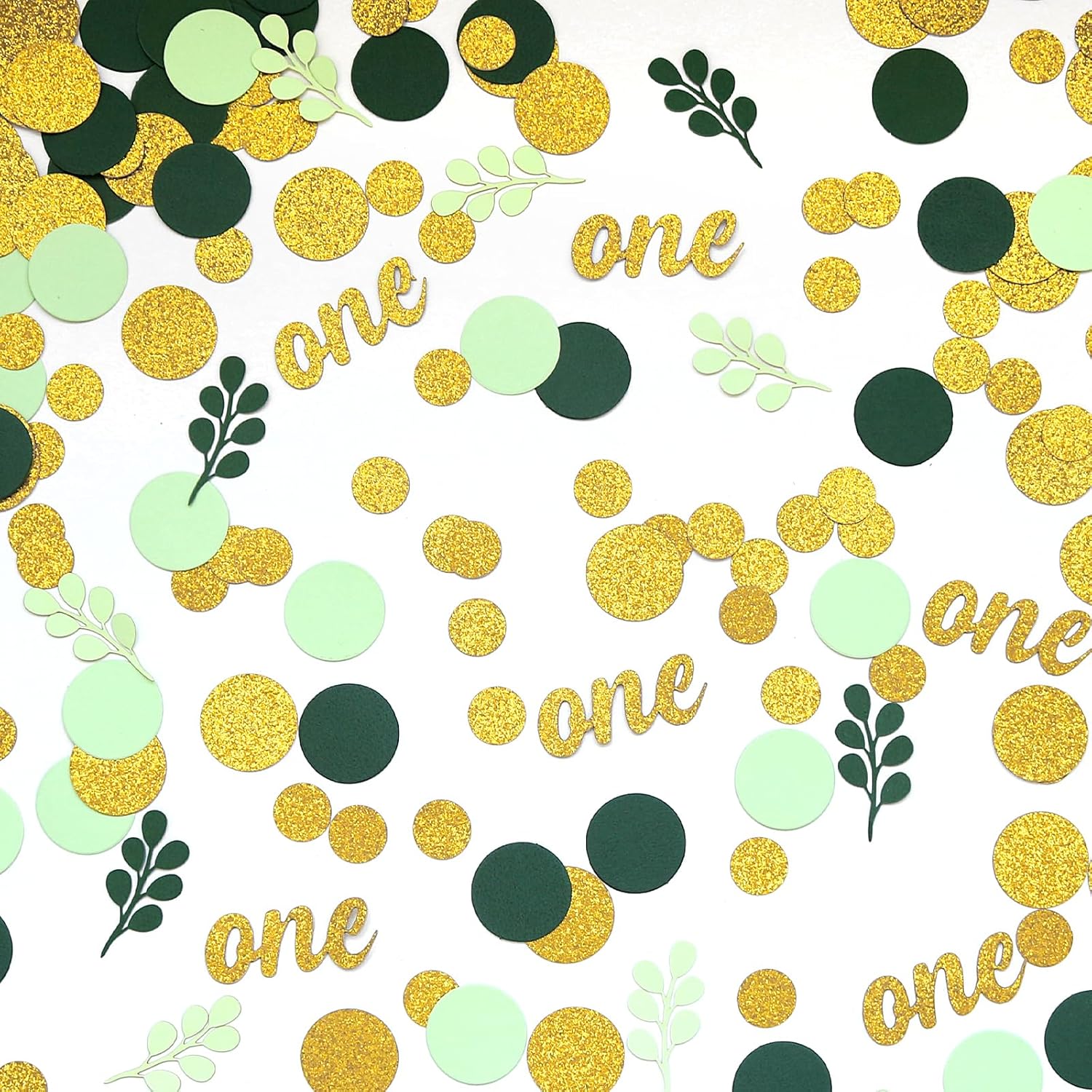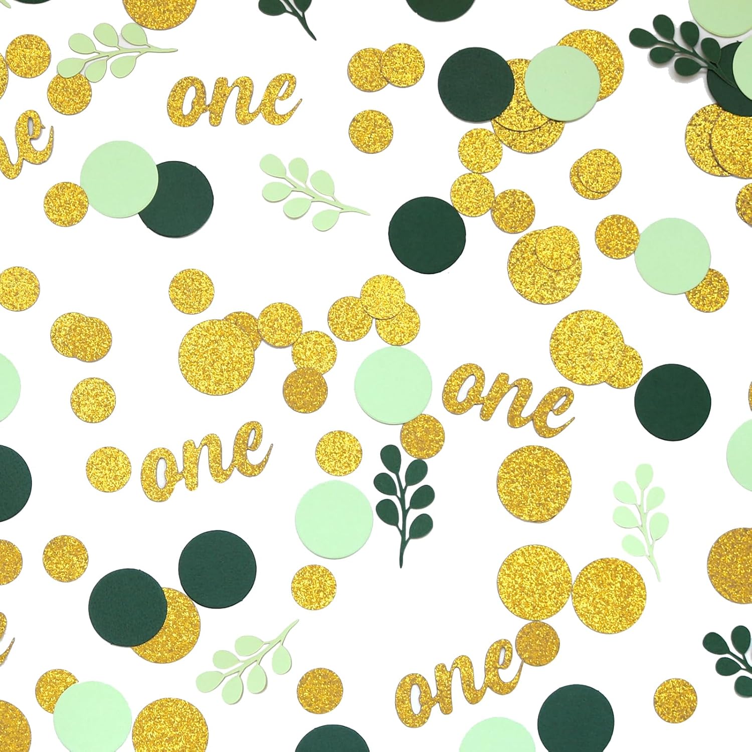 • 1.Great Addition to Your Baby First Birthday Party.The green and gold circle dots with one letter confetti scatter are shiny and fresh,very sparkle,a perfect addition to 1st birthday theme,nice green nature neutral baby girl/boy 1st birthday decorations.