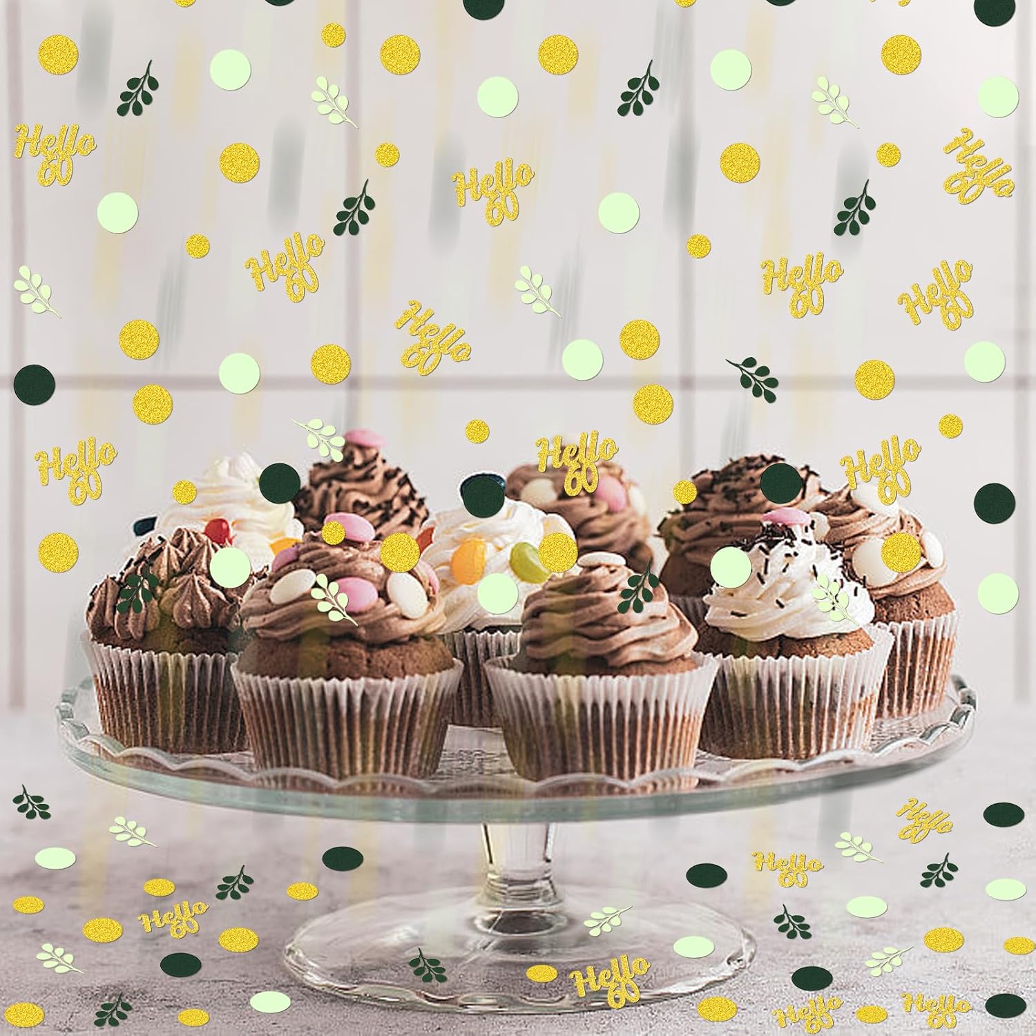 • 1.Great Addition to 60 Birthday Party.The green and gold circle dots with hello 60 confetti scatter are shiny and fresh,very sparkle,a perfect addition to 60th birthday theme,nice sage green 60th birthday decorations for women/men.