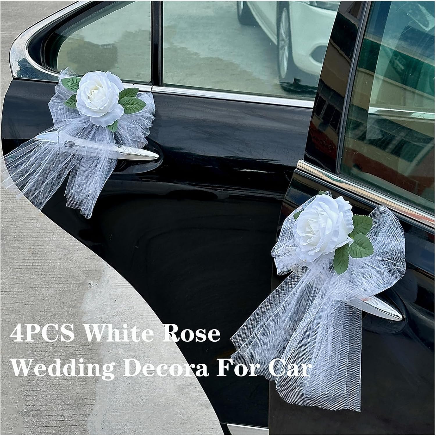 Elegant White Rose Wedding Car Door Handle Decoration – 12cm Artificial Flower with Leaf, White Tulle Bow & Suction Cup Attachment – Set of 4 for Bridal Vehicle Décor