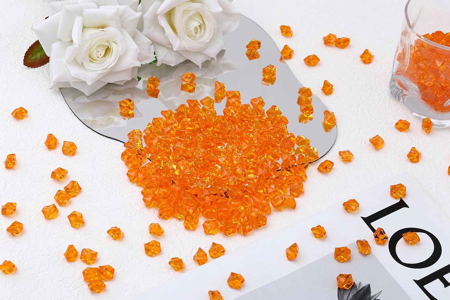LAIDANLA 500PCS Orange Acrylic Gems Vase Fillers Plastic Diamonds Orange Fake Ice Cubes Fake Crushed Rocks for Centerpiece DIY Party Table Scatter Prop Wedding Decoration Accessories