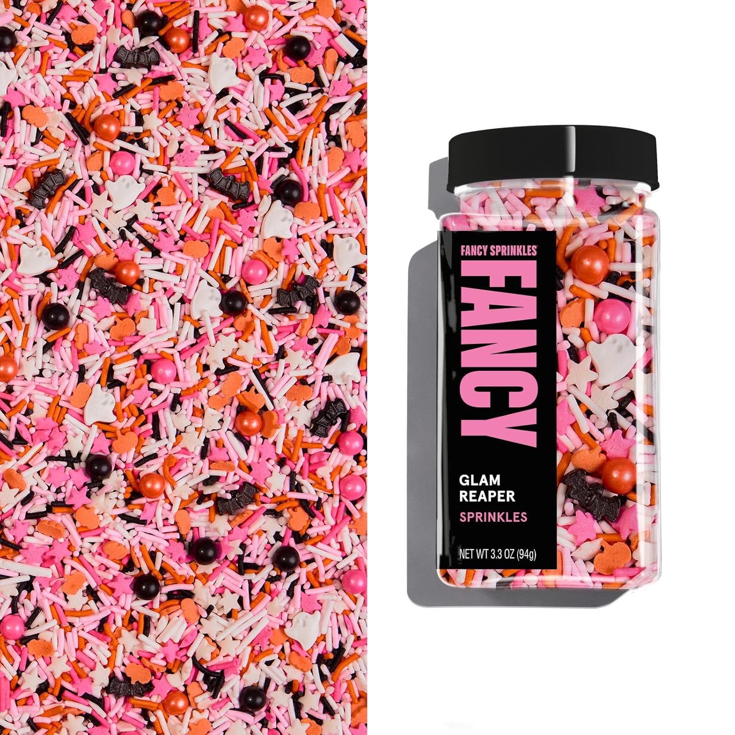 Fancy Sprinkles Limited Edition Halloween Glam Reaper Sprinkles Pink, Orange, Black, and White Crunchy Jimmies Candy Pearls, Bats and Pumpkins (0.5c)