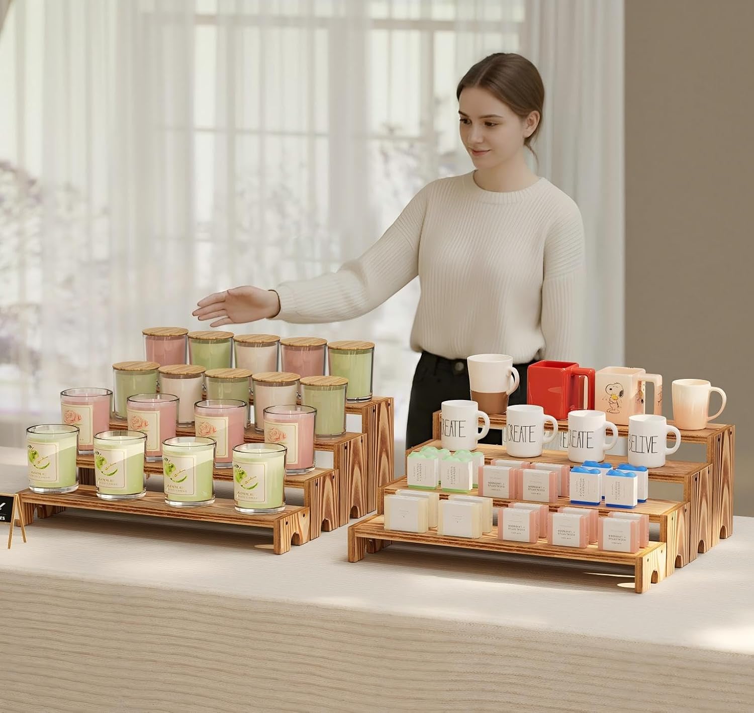 • 【All-Scenario Wooden Tiered Display Riser】Turn every nook into a styled gallery! Curate vanity perfumes, spotlight collectible figures in living rooms, stage succulent gardens in bedrooms, or organize spices/coffee gear in kitchens. Shift instantly from Tiered Spice Rack Organizer to party wooden cupcake stand, craft show display stands, or display shelf for vendors. Nestable 4-tier design adapts apartments to expo halls – becomes portable vendor booth display items for weddings/markets