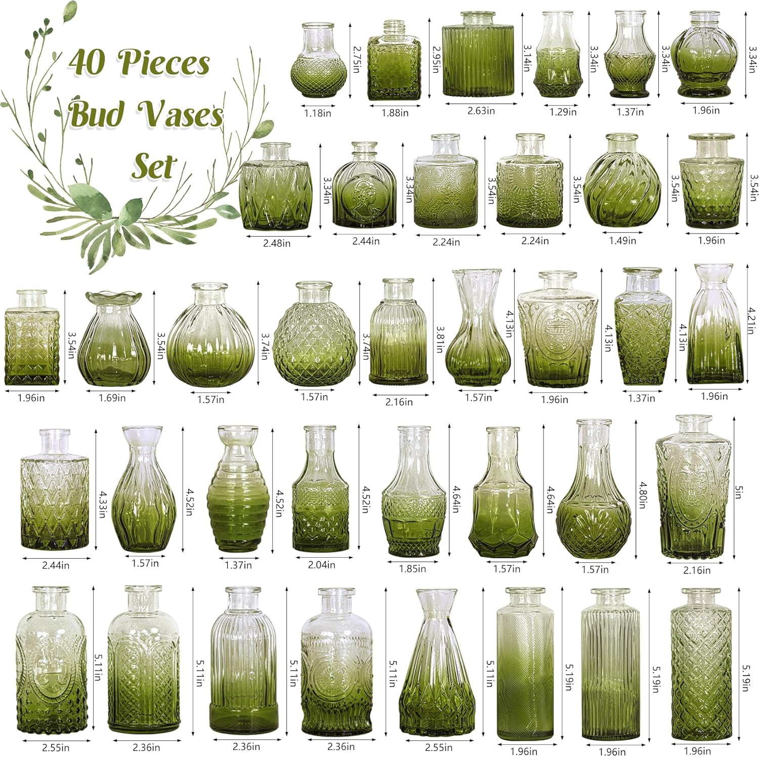 Set of 40 Glass Bud Vases, Small Green Glass Vases in Bulk, Mini Vintage Embossed Flower Vase for Wedding, Centerpieces, Birthday Party, Baby Shower, Home Table Decorations (Green)