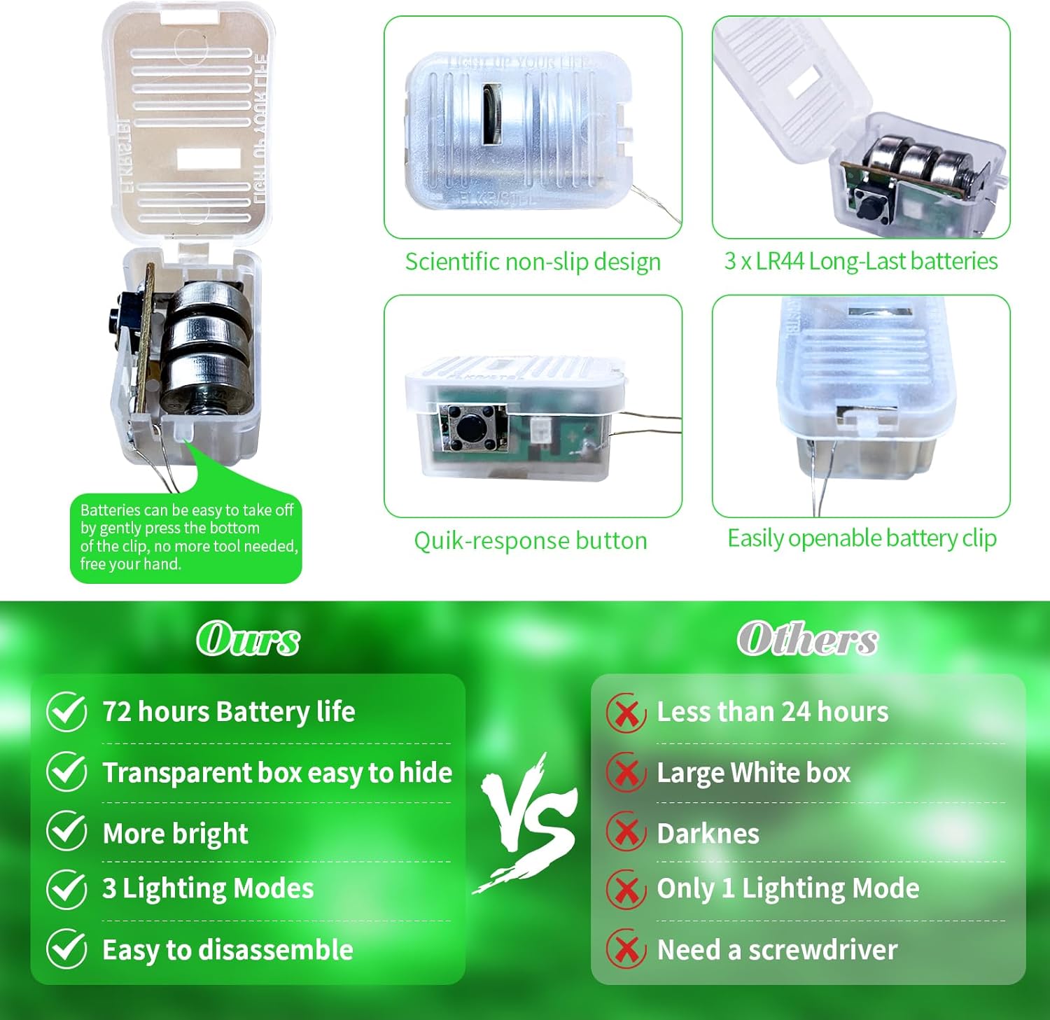 • UPGRADED DESIGH AND EASY TO REPLACE: The fairy lights'newest clear and small battery box is 0.78*1.20 inches in size, very easy to hide into all your DIY projects. The upgraded battery pack has scientific non-slip design on both sides, which makes it feel comfortable and easy to catch. Batteries are also very easy to take off, no more screwdriver needed, just gently press the bottom of the clip to open, free your hand