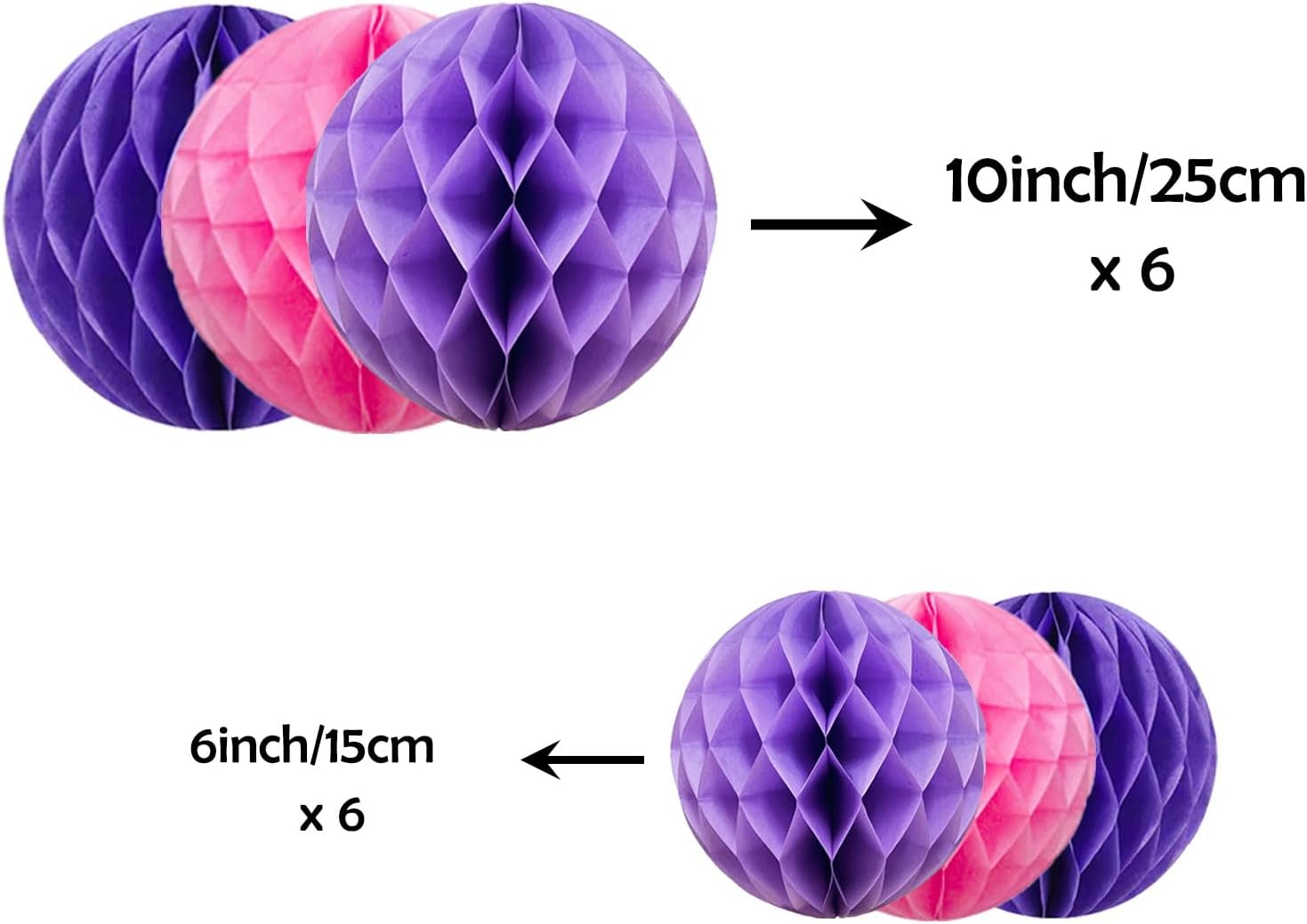 • HONEYCOMB DECORATIONS Package includes: 2 pcs 10" light purple, 2pcs 10" pink and 2 pcs 10" purple, 2pcs 6" light purple,2pcs 6" pink and 2pcs 6"purple honeycomb ball decorations.