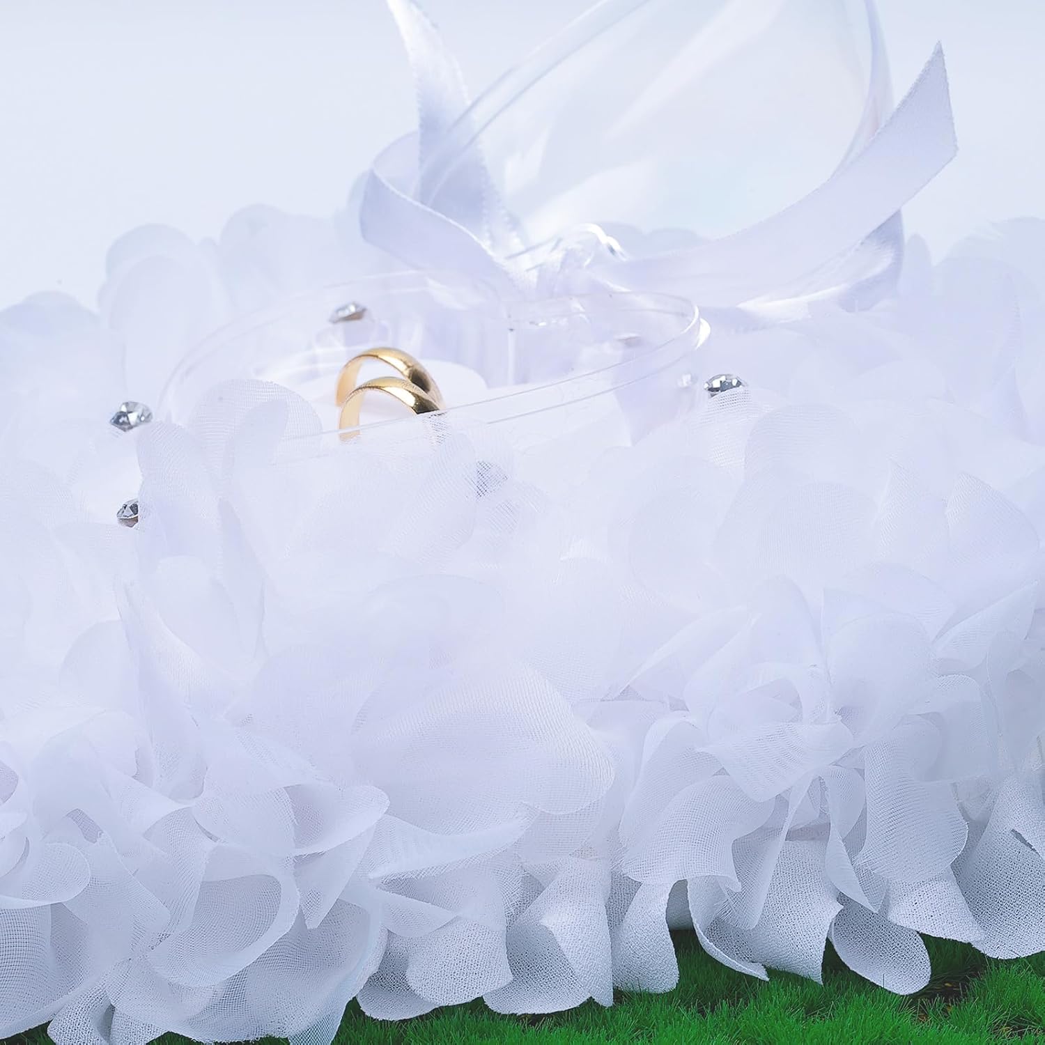 • Wedding Ring Pillow Design - Our Ring Bearer Pillows Is Exclusively Designed By Our Designer, With Pure White Flowers Wrapped Around Roses And Dotted With Artificial Diamonds In The Middle, Surrounded By A Transparent Heart-Shaped Ring Box. The Ring Cover Can Be Easily Removed, And There Is A Hanging Rope Design On The Top That Can Be Hung Anywhere On The Wall. The Ring Box Has A Unique Decoration And Can Store Two Rings. The Design Of The Ring Box Can Prevent The Ring From Falling Off And Being Exposed To Dust And Moisture.