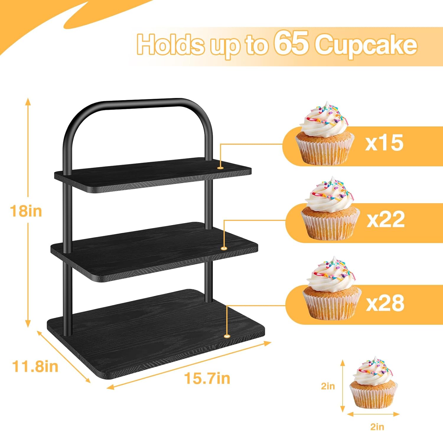 • Large Capacity Cupcake Stand – This 3-tier Halloween Cupcake Stand holds up to 50 small cupcakes with ease. Featuring sturdy square wooden boards in sizes up to 15.7” x 11.8”, it provides plenty of space to display spooky Halloween cupcakes, ghost cookies, or pumpkin muffins, creating a perfect dessert display centerpiece for parties.