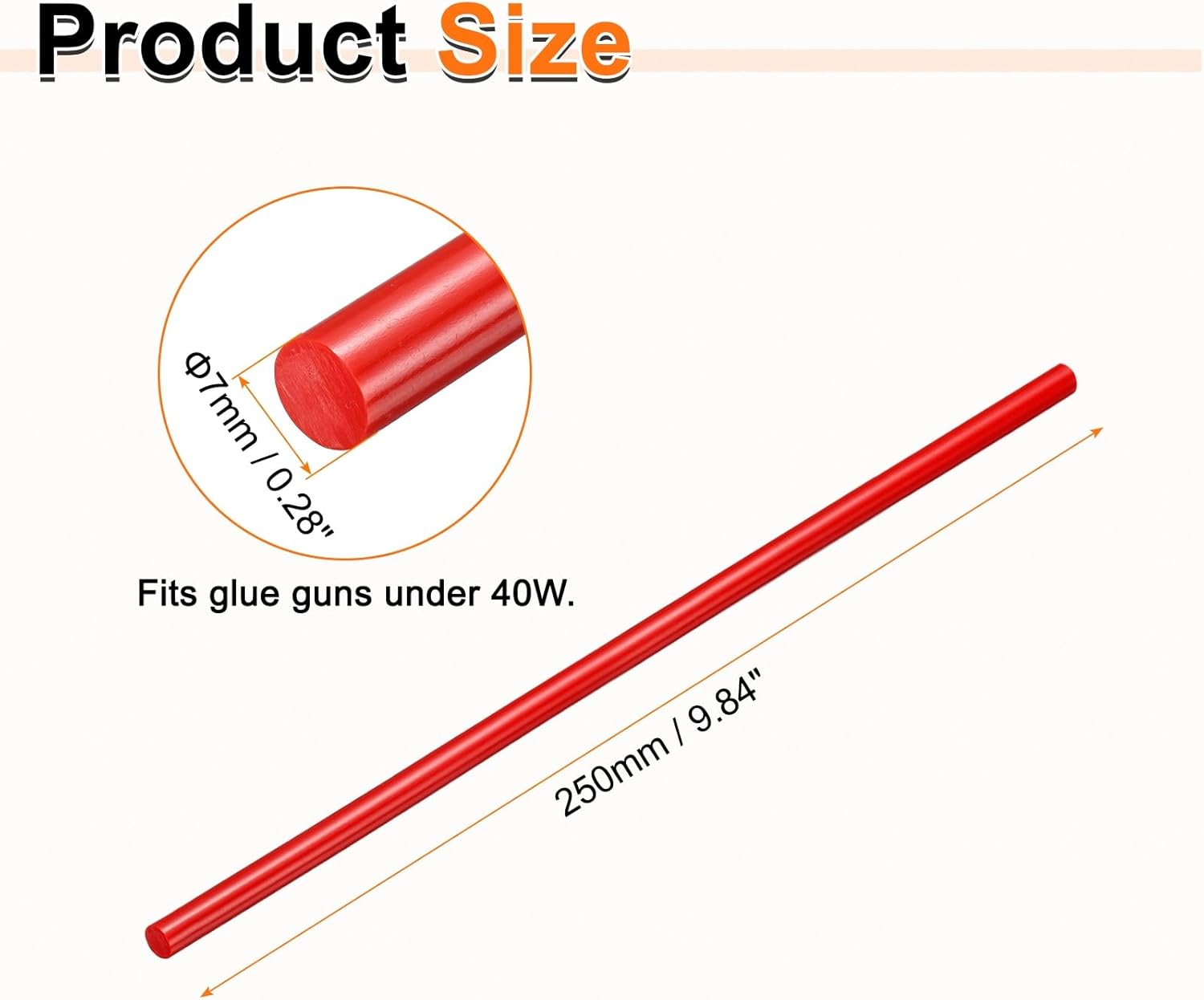 • Size - Hot glue sticks size: 7 x 250mm / 0.28 x 9.84 inch (D*L); Curing time: 10–15 seconds; Working temperature: 150°C (302°F); Softening point: 75°C (167°F).