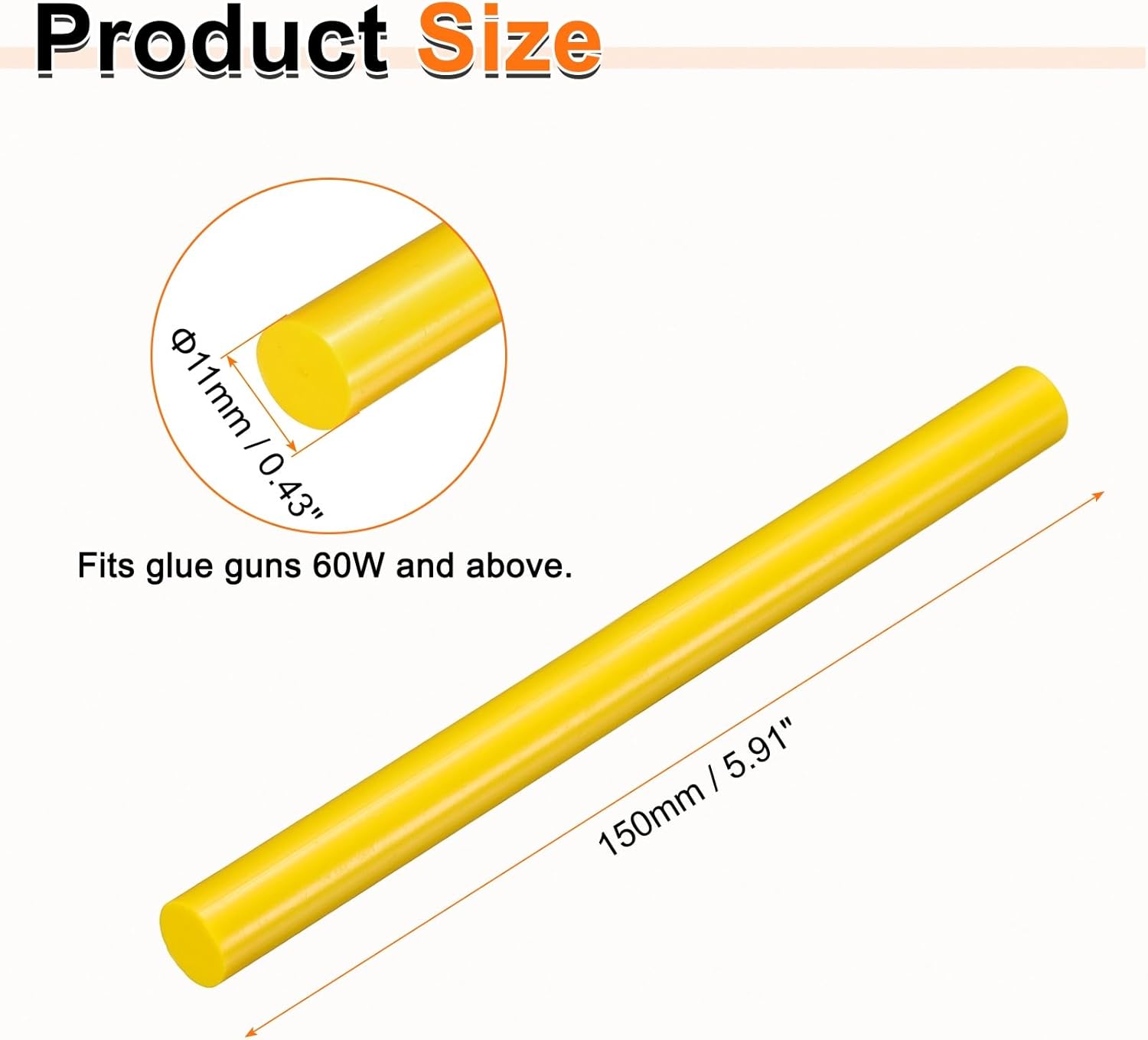 • Size - Hot glue sticks size: 11 x 150mm / 0.43 x 5.91 inch (D*L); Curing time: 10–15 seconds; Working temperature: 150°C (302°F); Softening point: 75°C (167°F).
