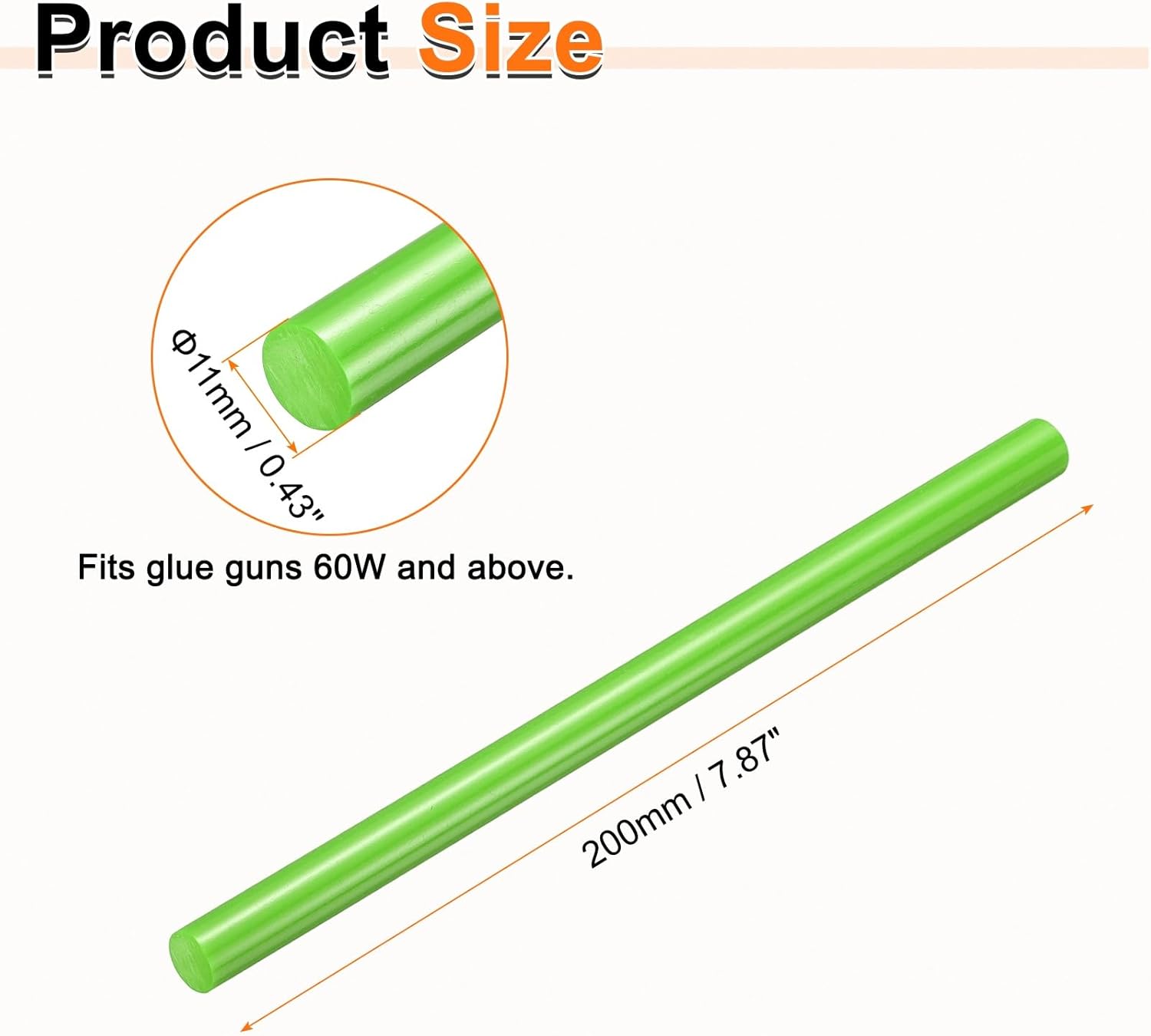 • Size - Hot glue sticks size: 11 x 200mm / 0.43 x 7.87 inch (D*L); Curing time: 10–15 seconds; Working temperature: 150°C (302°F); Softening point: 75°C (167°F).