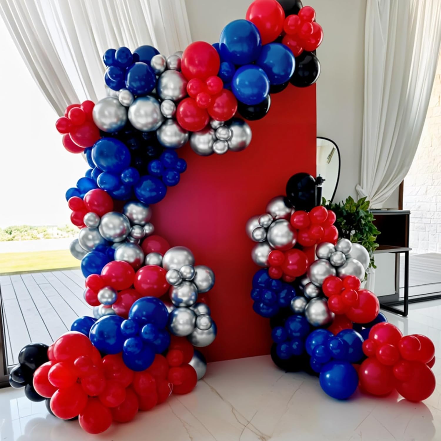 • 【Easy to Assemble】Easily fill the red blue black balloons with air or helium. Use the included silver ribbon to tie or suspend them on walls, arches, doors, or ceilings. Great for DIY enthusiasts—design balloon columns, centerpieces, or themed photo backgrounds. Whether you're decorating solo or as a team, setup is smooth and quick with impressive results.