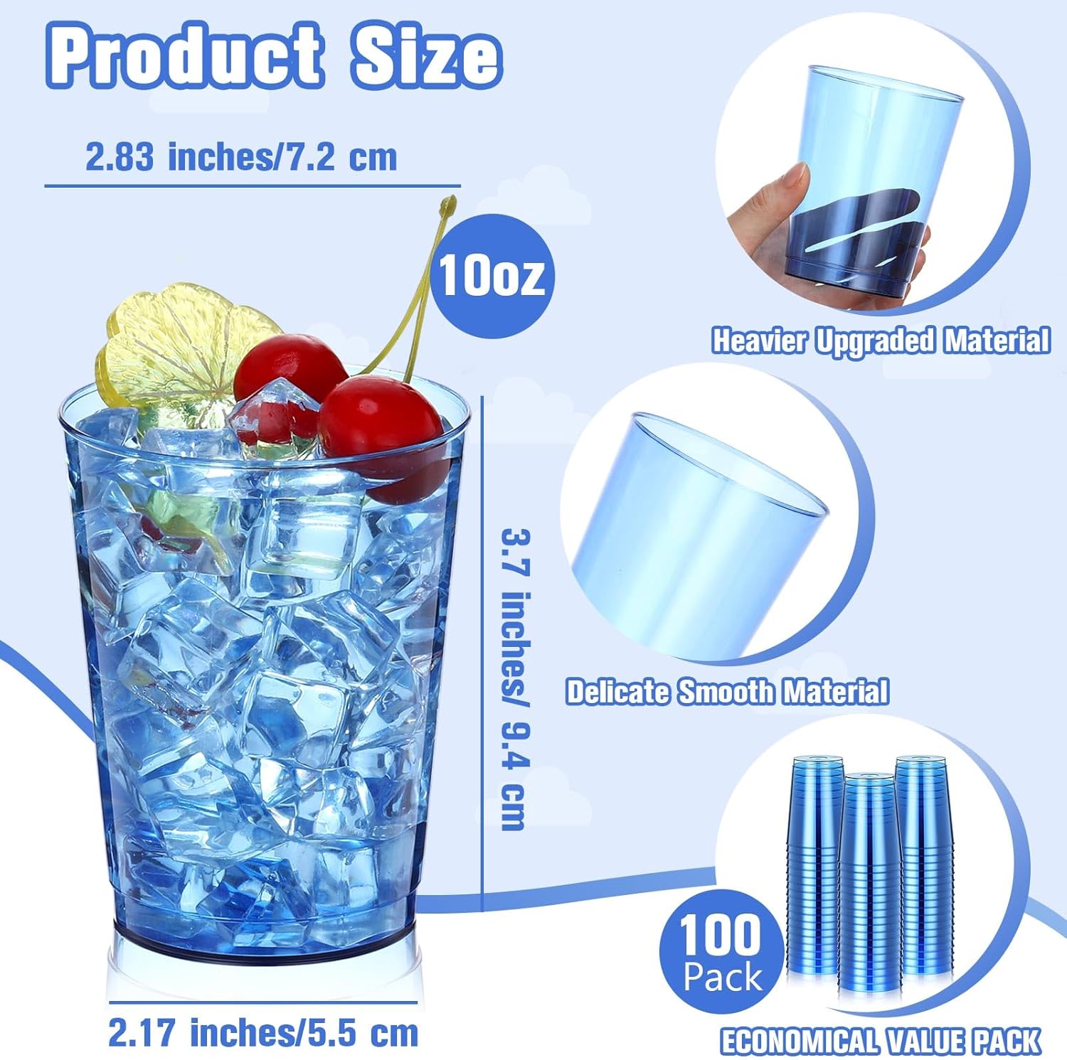Minatee 100 Count Plastic Cups Disposable Fancy Cups Heavy Duty Wine Cocktail Glasses for Halloween Wedding Christmas Birthday Party Supplies Plastic Drinking Tumblers(Blue,10 oz)