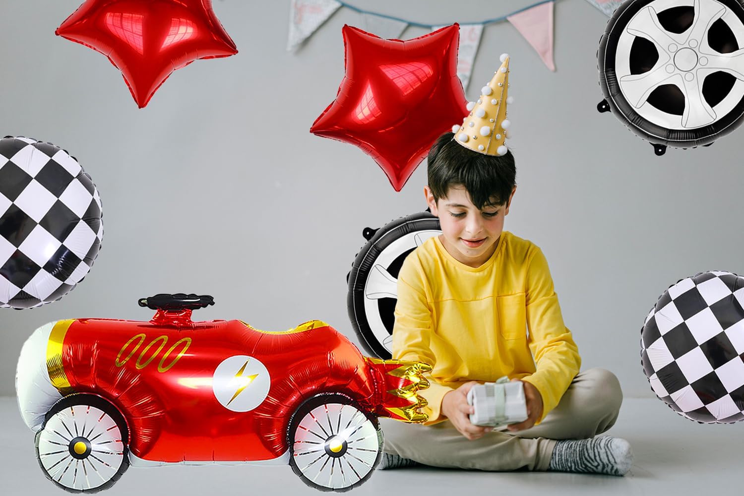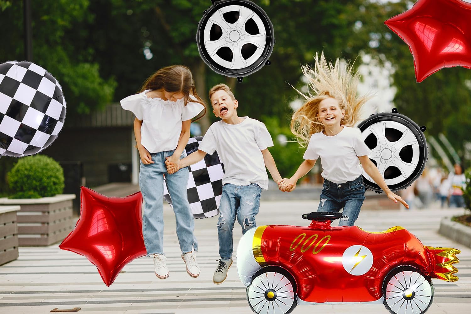 • 【 Appearance and Design 】 These aluminum foil balloons are designed in the shape of retro racing cars, wheels and tires, as well as black and white squares. The vivid and realistic appearance of the racing cars will attract the attention and interest of guests, bringing them a pleasant mood. You will receive 1 colorful racing balloon +2 wheel balloons +2 black and white checkered balloons +2 red star-shaped balloons (uninflated) + 1 ribbon roll.