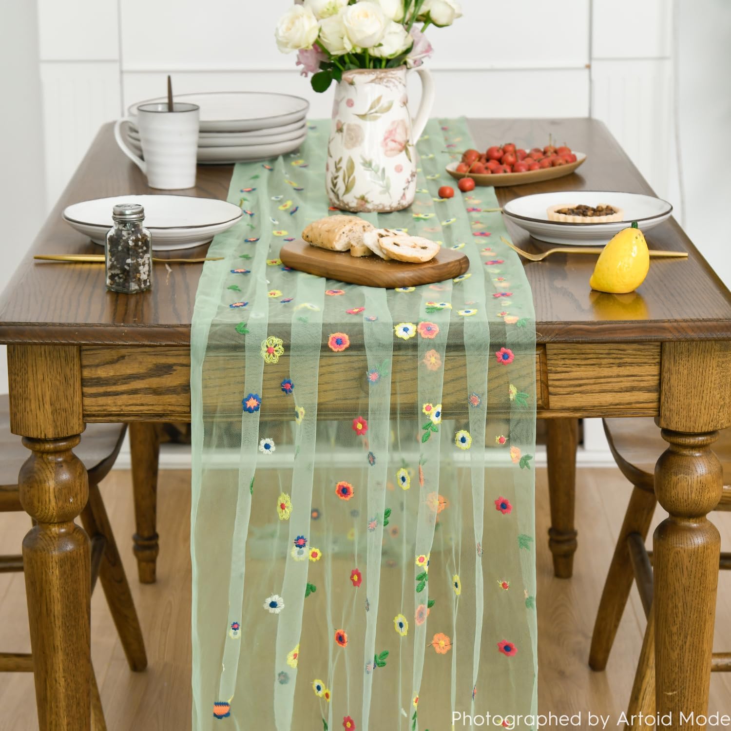 Artoid Mode Sage Green Embroidery Daisy Gauze Table Runner 120 Inch 10FT, Seasonal Sheer Dining Holiday Wedding Birthday Table Decor for Home Party