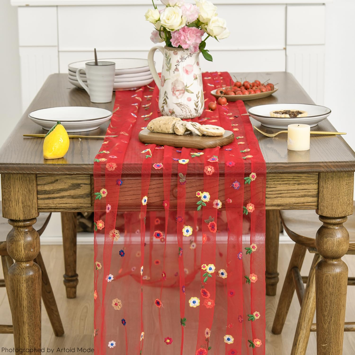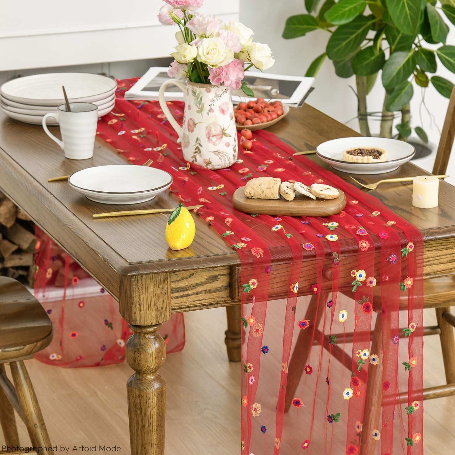 Artoid Mode 3PCS Red Embroidery Daisy Gauze Table Runner 120 Inch 10FT, Seasonal Sheer Dining Holiday Wedding Birthday Table Decor for Home Party
