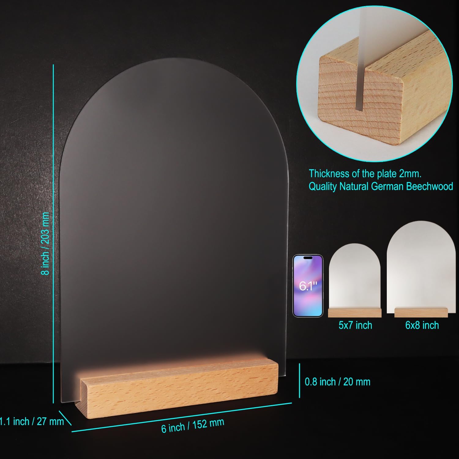 • PERFECT MATCH - This set includes 10 frosted arch-shaped blank acrylic pieces and 10 wooden sign stands for creating your own DIY wedding signs. Each blank acrylic piece measures 152x203x2mm / 6x8 inches, 1/8 inch thick,and each wood stand measures 127x28x20 mm / 5x1.1x0.8 inches. All acrylic pieces come with protective film on both sides to prevent scratches; simply peel off the film when ready to personalize.