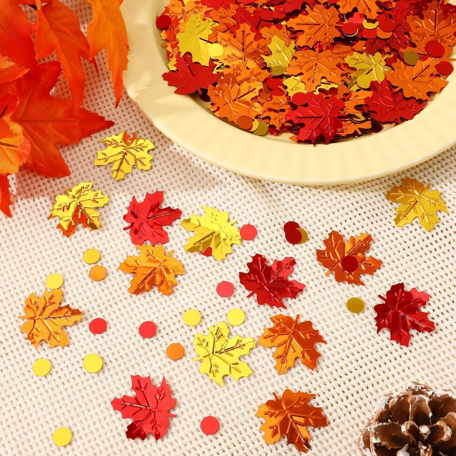 • Diverse Styles: Thanksgiving confetti is inspired by the beautiful colors of maple leaves in autumn, matched with small discs with appropriate size and color matching, and decorated with beautiful autumn decorative themes to help you decorate various parties in autumn and Thanksgiving
