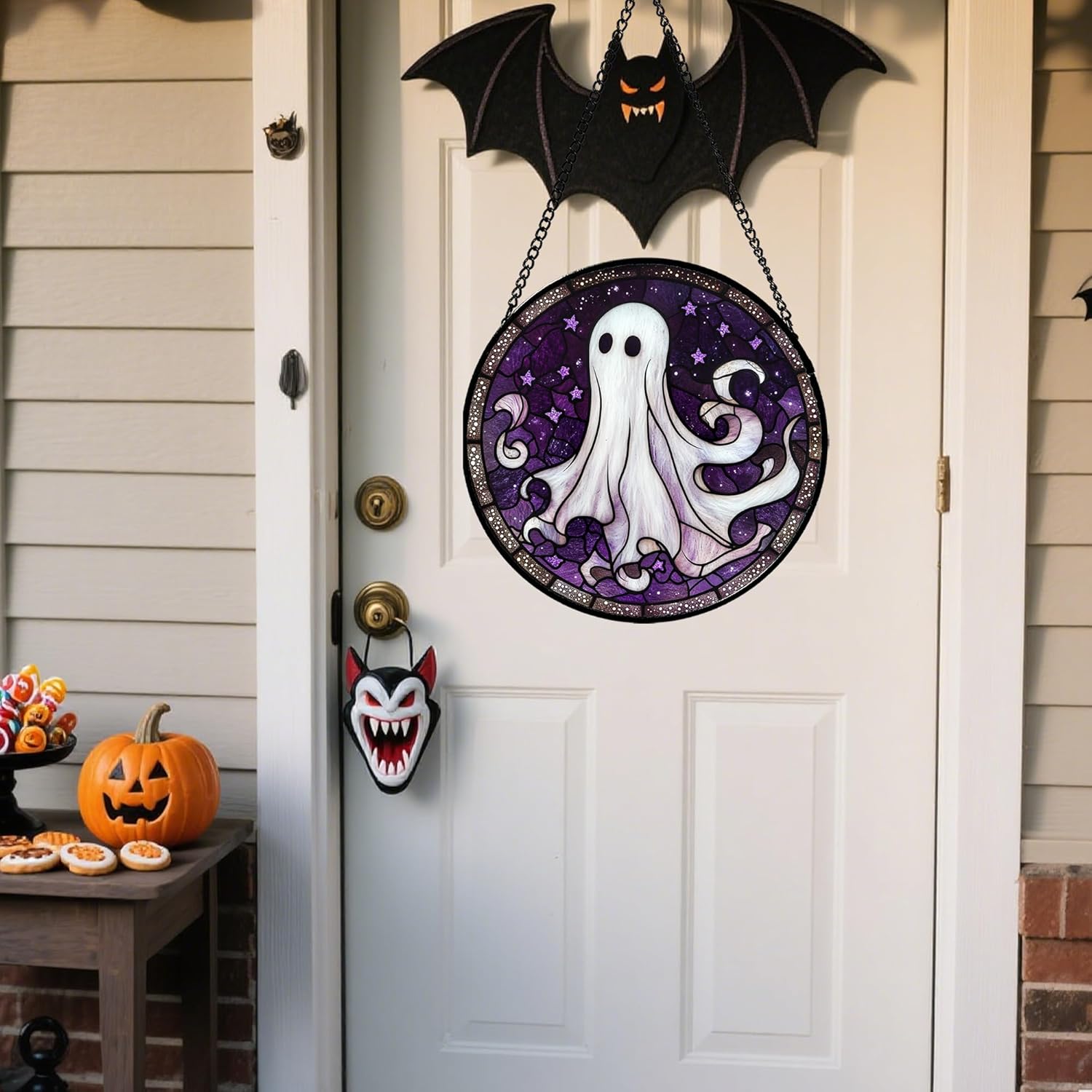 Stained Glass Window Hanging - Halloween Decorations White Ghost Purple Stars Suncatcher for Doors Garden Spooky Funny Sun Catchers Gothic Decor Horror Gifts for Women Men Friend 6.3 in