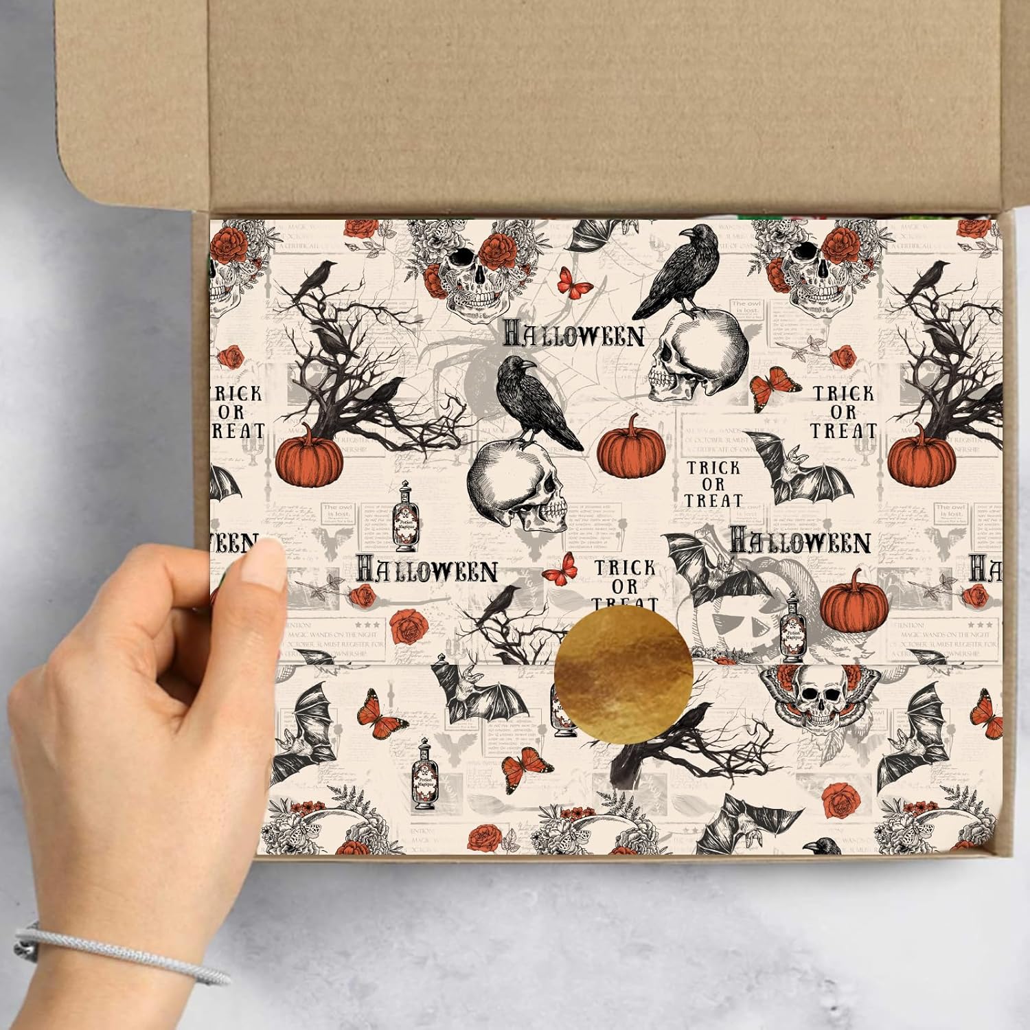 • GOTHIC STYLE: Our Halloween tissue paper is patterned with skull, crow, pumpkin and other elements, full of gothic style and vintage, great atmosphere creator for Halloween party