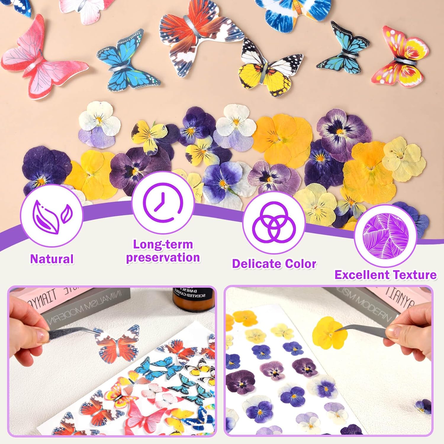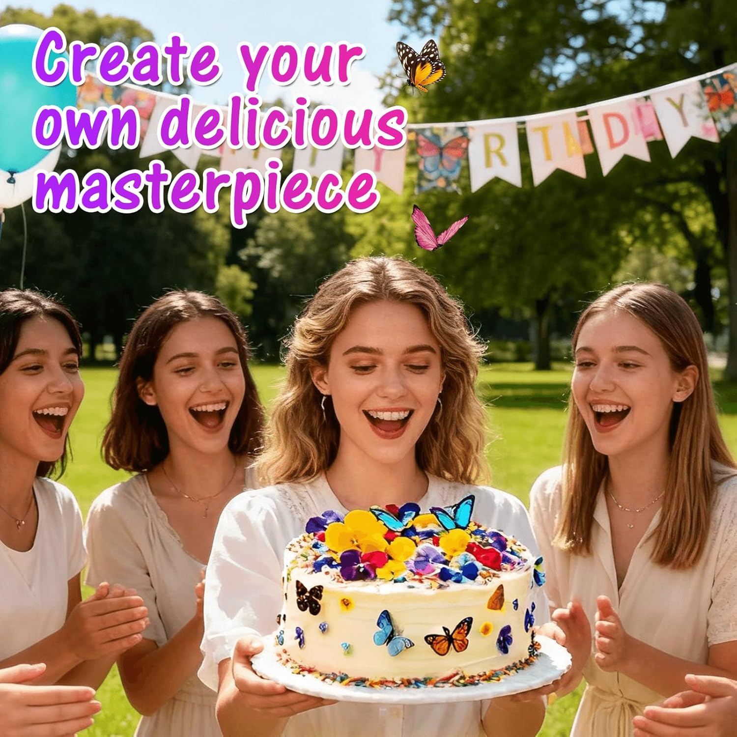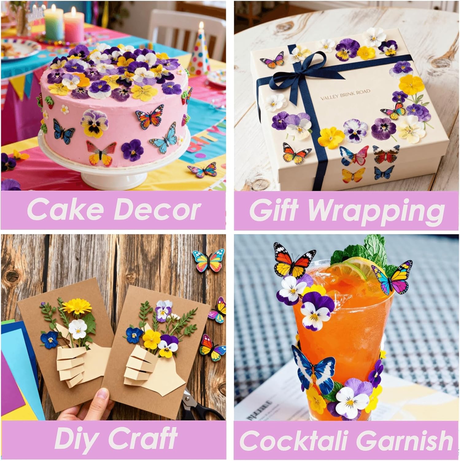 • Floral Butterfly Set : Includes 40 pressed edible pansy flowers and 40 realistic wafer paper butterflies in assorted styles, sizes, and colors—perfect for cake decorating, cocktails, and DIY crafts.